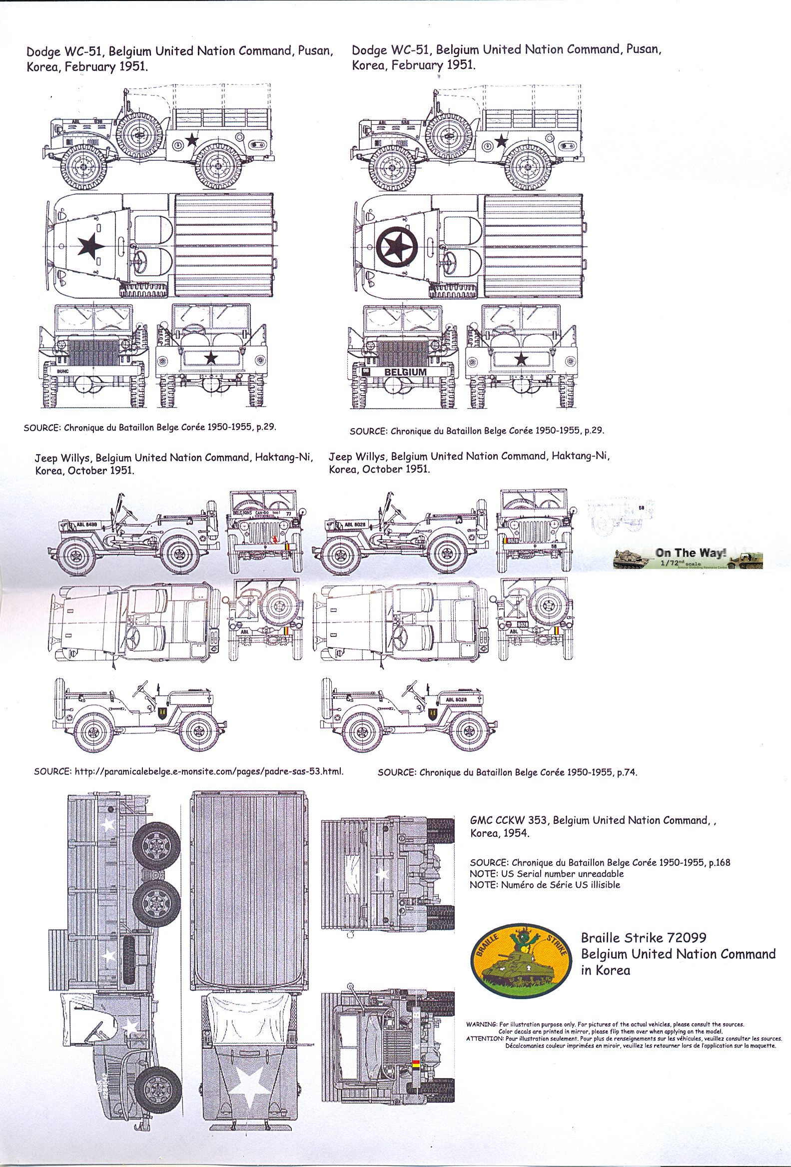 The reference for four of the five vehicles is given as Chronique du Bataillon Belge en Corée, while for one of the Jeeps pictures can be found on this site. Modelers are advised to examine the references to identify specific features of each vehicle. Looking