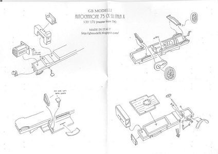 What you find inside the kit and how to assemble it The kit comes in a small plastic bag with the label at the top. The label has a small black & white photo of one of the most famous shots of this so old and rare vehicle. The model consists of around 60 light-amber-colored, cast resin parts, quite a great number for a resin kit. Parts are nicely cast, with no bubbles or warping. Many of the pieces are incredibly tiny and delicate, which made me think that I was surely going to break a number of them, which did not happen either because of my supernatural ability (difficult to believe) or because the pieces are intelligently secured, so that they can be removed easily. I was also surprised by the very small amount of flash which can be found. The assembly instructions are the standard exploded-view style with no written instruction. A brief inspection makes it easy to understand that there are no compromises between scale and historical accuracy. Every single detail is there: believe it or not, the three pedals are separate and must be assembled, as you can see from the photo below (one of the worst moment of my whole modeller's life was when one of the pedals fell to the ground from the tweezers - one of the best moments was when I got it back !). Two of the pedals are identical and must be glued close to each other and another one is different and must occupy another hole on the right. Despite their dimensions, you can notice the differences between the three and need to pay attention to choose the right one. Pieces go together very easily, so that no filing or cutting is required to make them go where they should. There are five very small and delicate wheels which must be glued to the gun: the bigger one goes on the right upper side, as it can be deducted by carefully observing the instructions. Speaking about the gun, it is a beautiful kit in itself, and it is also sold separately as a stand-alone piece (kit # 72014). The elevation is not fixed, even though you must choose the one you want before assembling the traversing mechanism, which sadly stops the gun from moving. The muzzle comes pre-drilled, even though drilling it would not be difficult. ![]() The vehicle can be mounted both in travelling or in firing position, and the differences can be clearly spotted in the instructions on the left. I know I am asking for too much, but it would have been really great if the ammunition container between the cabin and the gun were provided both in closed and open position, with the shells visible, as we can see it was during firing. |