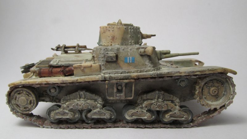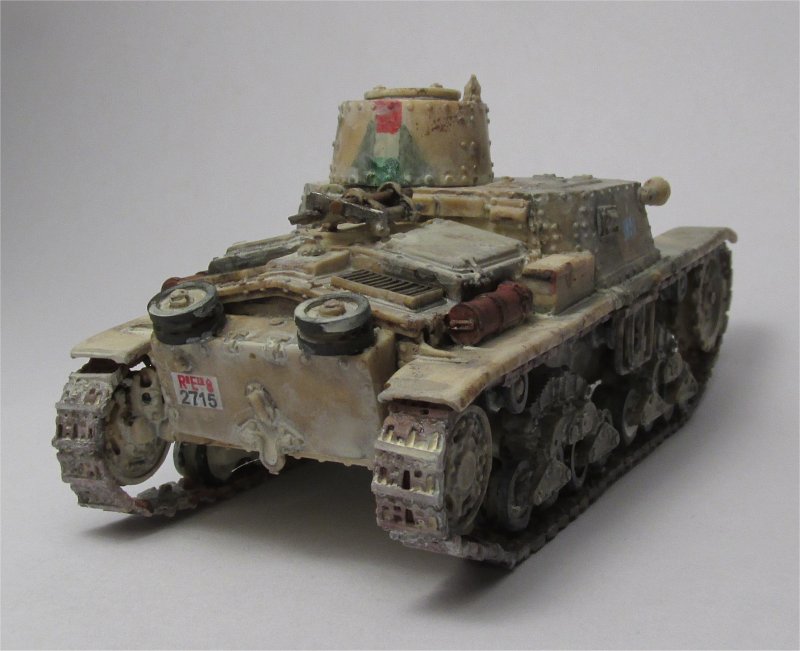 These vehicles had either a white cross (earlier) or a vertical Italian flag on the turret back, so I hand painted the last one. Also, they had a posterior license plate with numbers starting with 27, plus tactical markings which I took from an Italeri M13/40 kit.