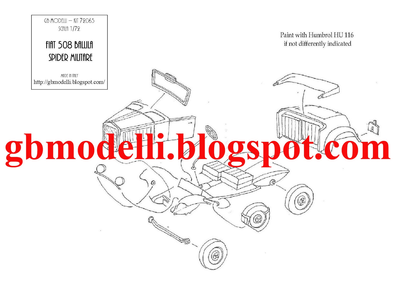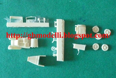 I am happy to see that GB Modelli has started protecting their kits with a sturdy cardboard box, while previously they were sold in simple, unprotected plastic bags. The parts are very crisply molded, with quite a bit of flash, which is something you must expect from limited-production resin kits; being very thin, it can be easily separated form the pieces. No warping, no pin-holes and minimal attachment blocks. The resin is soft enough to be easily cut with a sharp hobby knife without splintering or excessive effort. All the most important elements are present and recognizable, althought the final model is very small: some scratchbuilding abilities are requested, since some parts must be provided by the modeller, such as the trasparent part for the windshield. The assembling instructions are the typical GBModelli style drawing on paper.