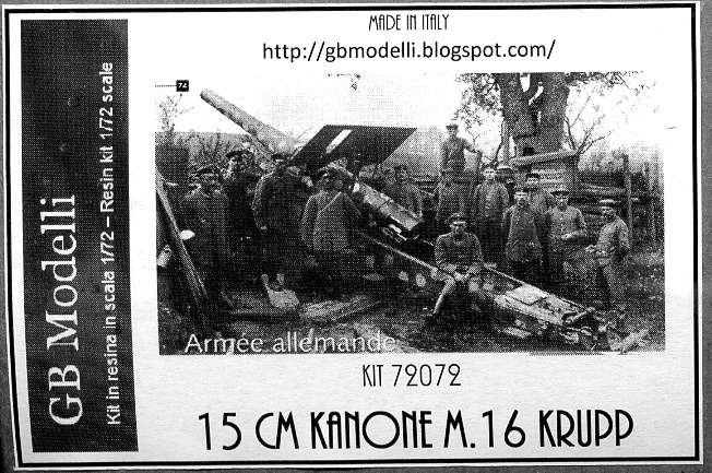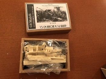 | The 15 cm Kanone 16 (15 cm K 16) was a heavy field gun used by Germany in World War I and World War II. Guns turned over to Belgium as reparations after World War I were taken into Wehrmacht service after the conquest of Belgium as the 15 cm K 429(b). It generally served on coast-defense duties during World War II. I am happy to see that GB Modelli has started protecting their kits with a sturdy cardboard box, while previously they were sold in simple, unprotected plastic bags. The parts are very crisply molded, with quite a bit of flash, which is something you must expect from limited-production resin kits; being very thin, it can be easily separated form the pieces. No warping, no pin-holes and minimal attachment blocks. The resin is soft enough to be easily cut with a sharp hobby knife without splintering or excessive effort. The model is well-engineered, so that only a limited amount of scratchbuilding and adding details is needed. The website of GBModelli has a page where pictures of the real gun are shown, which will further ease construction.