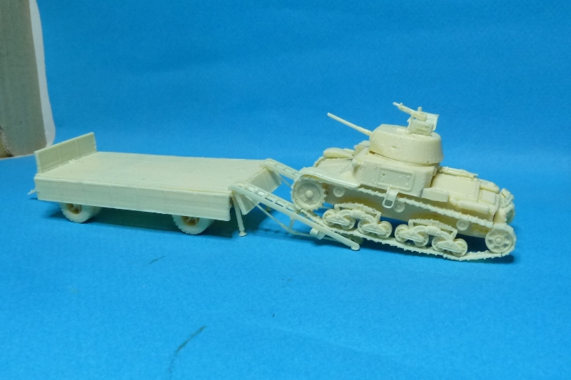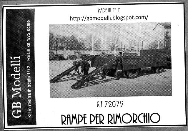 | These removable ramps were specifically designed for loading/unloading M-serie tanks (M13/40, M14/41 and derivatives) from the Viberti trailer, so that their width was precisely matching that of the M-serie tracks. They must be paired with the Viberti trailer, which GB Modelli sells as a separate kit. Together, they look a good complement to the M13/40 which is produced by GB Modelli. I am happy to see that GB Modelli has started protecting their kits with a sturdy cardboard box, while previously they were sold in simple, unprotected plastic bags. The parts are very crisply molded, with quite a bit of flash, which is something you must expect from limited-production resin kits; being very thin, it can be easily separated form the pieces. No warping, no pin-holes and minimal attachment blocks. The resin is soft enough to be easily cut with a sharp hobby knife without splintering or excessive effort. The model is well-engineered, so that it is possible to build it in loading/unloading state and in transport mode. The website of GBModelli has a page where pictures of the real trailer with ramps are shown, which will further ease construction.
