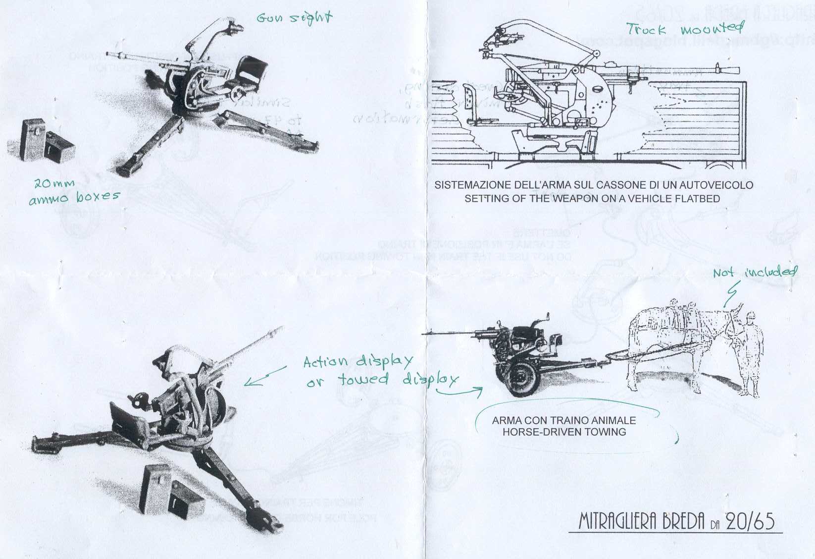 Instructions The 2nd page of GB Modelli's instructions portray the gun deployed, and mounted on a truck bed without the tripod legs, and being towed by a mule or donkey; the donkey and crew figure are not included in the model. After assembly I believe that while serving in North Africa the weapon would be finished in gunmetal and desert tan. The gun in Italy, the Balkans and Russia would be colored gunmetal and gray-green color. |