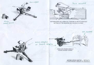 Though not labeled as the Breda Model 35, this automatic cannon matched my references for the Breda Model 35 gun. This AA gun was a primary light anti-aircraft weapon for the Italian military and also served with German forces and was sold to Finnish forces during WW2. The gun was designed to be towed by mule or draft horses, pulled by several soldiers over short distances, or commonly carried in truck beds. In addition to being used for AA defense it was used as a ground weapon. |