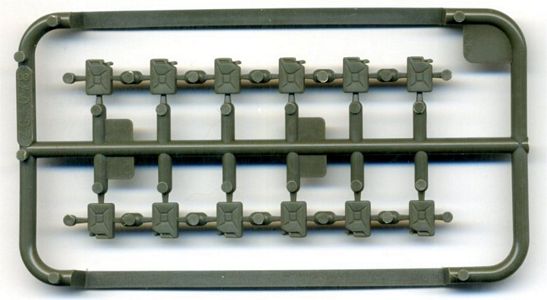 The box contains four sprues, one containing the jerrycans (2x) and one containing the drums (2x): in total, 8 drums and 24 cans can be assembled, plus 2 pumps (one for each sprue). In fact, no assembling is needed for the jerrycans, which are supplied as a single piece with handle and cap already in place. On the other hand, the drums need assembling of three parts. The handpump is a two-part assembly and it can be very useful if building a small scene of personnel filling jerrycans from drums. There are two different types of drums, differing from each other in the rib detail. Doing some measurements, it seems that WW2 German 200L drums were 54.5 x 86.5 cm, or 7,56mm x 12mm in 1/72: these drums measure 7.7mm x 12mm, which I would call almost perfectly in-scale. German 200L drums had some markings on the flat top and they are correctly reproduced here: the drums bear the writings 200L, Kraftstoff, Feuergefährlich, Wehrmacht or Heer arranged in different ways; you can also read 1943 and 1944 on two of them, which would clearly prevent you from using them in an earlier setting. | ||