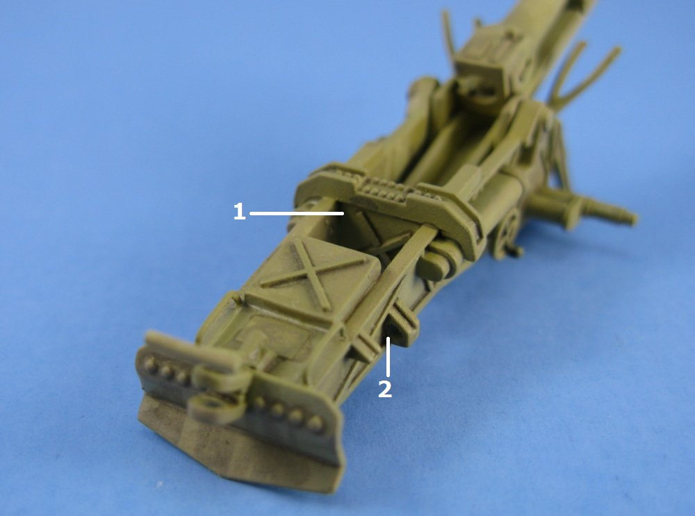 The eyes in the tow ring are a tad too small so they were drilled out and handles at the rear of the trail were added using some thin wire. Two pieces of ammunition are included. They don't look too good and if ammo is desired for the gun it would be best to obtain the sIG33 ammo