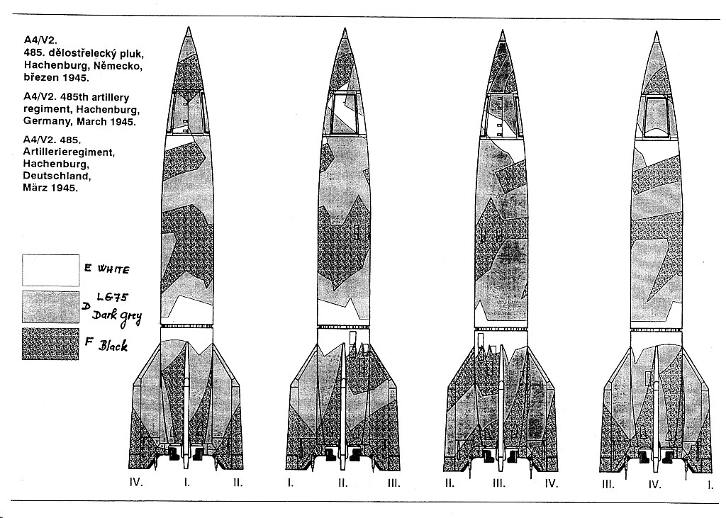 The parts are for the most part well cast, though the body and fin pieces have a definite pebbly/orange peel texture to them. The molds are a bit off, so many of the pieces have seams to scrape and sand. This is most noticeable on the small parts and along the edges of the fins. There are no locating pins on the parts so some care is needed to align the pieces. The kit comes with no decals. Building is straightforward though a bit time consuming. The two body halves go together well. One body half has a pair of molded on fins. The remaining fins just butt join to the fuselage. For all four fins there are substantial seams to deal with where they meet the rocket body. The launcher (parts 6, 9 & 12) has sink marks and depressions that need filling. Instructions are a bit vague regarding the placement of the launcher parts. Some care will be needed here and it is a good idea to refer to some pictures of the real thing to help with part locations. I replaced the small guide probes located at the trailing edge of the fins with pieces of wire cut from guitar strings. The stock plastic pieces were too thick and didn't allow the rocket to seat properly on the base. I also replaced the arms and handles (parts 11) for the leveling cranks with plastic rod as the kit pieces were quite blobish. The rocket was painted with Aeromaster and Testors enamel paints. The splinter pattern was painted in layers, starting with the off-white layer, which was masked after it was dry and then the dark yellow/sand colour was sprayed. This too was masked after it dried and the final coat of dark green was applied. The masking was carefully removed and the rocket given a final coat of Testors Glosscoat to even the layers of paint. Once completely dry, a final coat of Aeromaster Acrylic flat was applied. The launch pad was sprayed dark grey and it too was flat coated after it had dried. The rocket cone and steeling vanes were both painted flat black and then dry brushed with silver to give them a metallic sheen. A circular cover for the exhaust cone was made and then sprayed Testors gloss red. This was super glued to the end of the cone. Last was the addition of the steering vanes. The completed rocket was then mounted on the launcher. In conclusion, the kit is definitely worth the money. Though the parts are a bit crude in places, and some major filling is required around the fins, the kit builds into a nice replica of the infamous A-4/V-2. Review sample purchased by the author. |