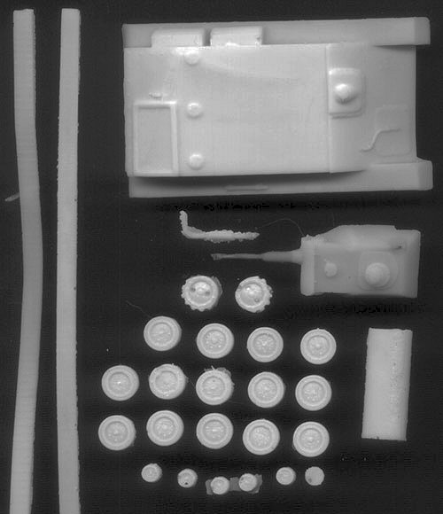 Do you see the faint track link lines on the strips of resin track? Well, those lines are easier to see in this scan then they are up close. These "tracks" are useless. On the positive side, the wheels look very well detailed (on the outside surfaces only). I also like how Czech Kits place wires down the length of the cannon barrel to prevent warping. Too bad other resin manufacturers do not do this.
