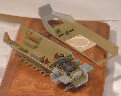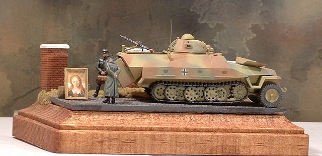 ![]() The Sd.Kfz 251 armoured halftrack (often referred to as the "Hanomag", although Hannoversche Maschinenbau-Anstalt und Eisengiesserei was only one of the firms involved in its production) was first issued to German troops in the spring of 1939 and first employed operationally in Poland. The 251 design was quite innovative, and probably deserves at least part of the credit for the success of the "Blitzkreig" strategy which served the Whermacht so well in the first half of the war. It allowed German troops to accompany the fast moving panzer columns while affording them some measure of protection. This made the halftrack superior to trucks but cheaper and faster than fully tracked personnel carriers. During the war, approximately 16,000 251s of all marks (A, B, C and D) were built, with production continuing in Czechoslovakia for some time following the end of the war. The majority of the vehicles built were model "D", comprising more than 10,500 of the total 16,000. The 251 served with panzer grenadier, reconnaissance, artillery, and specialist units on all fronts in a variety of configurations. The basic design was adaptable to wide range of functions, including anti-aircraft, engineer and communication/command. In addition to the more than 20 factory built versions, there are also a number of known field modifications, which reflect specific needs or the availability of local resources at the time. The vehicle I have chosen to model is one of those field modifications, with the turret of a Renault R35 light infantry tank mounted over the passenger compartment. The Hasagawa Sd.Kfz 251 D Hasagawa's 251 D is a very nice kit on its own. The moulding is sharp and the dimensions seem quite good. It is also, of course, the first small-scale version of this important vehicle produced in plastic. It is available in three major versions, the 251/1 armoured personnel carrier, the 251/9 heavy support vehicle (with short 75mm gun), and the 251/22 late war self-propelled anti tank gun. The build itself is quite straightforward. There is a reasonably detailed interior provided in the original kit, with an instrument panel, seats, a radio and the steering wheel mounted above the drivers seat, angled downward, as on the real vehicle. I painted the entire interior dark yellow before adding anything. After assembling the basic detail, I first added the Extratech engine compartment detail, which I will describe below. In the drivers compartment I used the Osprey Sd. Kfz book as a guide to add some more detail, mostly gear added to the side walls. To take advantage of the spring details on the back of the seats, I recommend some drybrushing - I used a gun metal silver gray after painting the frames of the seats dark yellow and the cushions reddish brown. The radio was painted olive green (according to Osprey) with the details picked out in white and black. I added three gear shift selectors (or maybe two shifts and a parking brake?) to the floor between the two seats and painted them black. The steering wheel was also painted a medium gloss black. It was at this point I realized that, with the Renault turret modification, the detail I was adding to the drivers compartment would be very difficult to see. I could choose to leave it out (which, having done most of the work already didnt appeal to me) or do a few things that would make it more visible. I chose to 1) build the vehicle with the armoured vision port open (requiring something to simulate the armoured glass inserts) and 2) open up the rear doors so a viewer could look through the back right through to the forward compartment. With that decision taken, I began adding more detail to the interior, which became a mini model in itself. With the turret, I assumed that there wouldnt be enough room inside for the forward seats. I therefore left them off, replacing them on the starboard side with the ammunition bin from the Sd. Kfz 251/9 kit and on the left with a folding jump seat, as was found in the /22 according to Osprey. I also added a few cases of ammo (from the old Fujimi Sd. Kfz 222 kit) one opened with the small shells showing. I also added a jerry can (one of the beautiful resin ones produced by Mars) beside the ammo bin and some miscellaneous gear. The two rear seats I think I added before I painted the interior. I found they are a bit thick around the storage bins in the upper part, so I thinned them a bit with an exacto. Early 251s seem to have had very nice leather covers on the passenger seats, while later in the war these were replaced with simple wooden slats to simplify production. The Hasagawa lower seats are kind of a mix of both seats. They are shaped like the early seats (sort of puffed up) but look more like the later seats, which should sort of "concave" higher at the front, low in the middle and bit higher at the back. The later ones should also show the slats. I compromised by simply scribing lines onto to the existing seats, and giving them a light wash to pick out the lines. The upper parts of the seats, the back rests, seem to have been padded in the later 251s, so I left them as is and painted them reddish brown. Finished, for the time being, with the lower hull, I super glued the resin plate over the opening in the upper half of the hull and painted it dark yellow as well. After adding the radio and a piece of kit between the two vision ports (a Prieser German mess tin), I considered what I wanted to do about the turret. The ModellTrans turret is moulded solid, with a shallow hollow area behind the hatch where you could place a figure. As such, there was no point making a hole for the turret. Instead, using a piece of plastic strip, I roughly outlined the circle where the turret would attach to the plate, so it wouldnt look quite so blank on the bottom of the mounting plate. Finally, although I have no source or historical justification for this, I assumed that there would be a hanging seat beneath the turret for the gunn