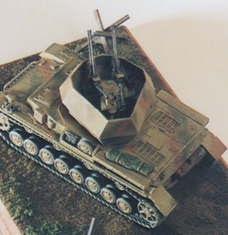 The main problems of the ESCI kit, if you can find a copy of it now, are thickness of the turret sides and the 20 mm gun barrels. In this, ESCI was inhibited by the technology of injection moulding. Also, there are a few problems with the ESCI Panzer IV chassis. While you can thin down the sides of the turret, to me it always looks too chunky. The more recent Hasagawa kit of the Wirbel suffers from much the same problem (plastic thickness) and the "unsatisfying" rubber tracks. The actual quad 20 mm in the turret of the Has. kit is probably on par with the ESCI version, although I prefer the latter.