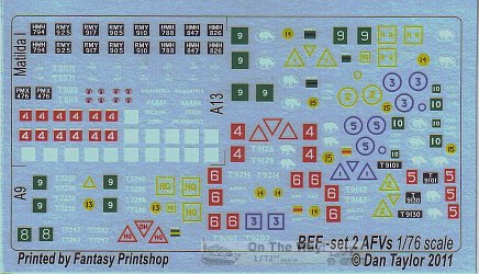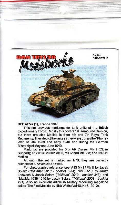 To quote the preamble from Dan Taylor Modelworks: "This set provides markings for tank units of the British Expeditionary Force. Mostly this covers 1st Armoured Division,