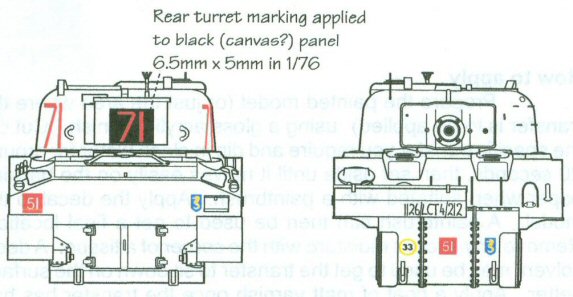 | Mk Vc T228789 “71” CAROLE This vehicle didn’t have the hull appliqué armour. It had the cast hoods, the padded lifting points on the glacis and the turret with the cast-in armour without the pistol port. The tracks were the metallic T62 type. The LCT number was 1126/LCT4/212 on the right hull side and on the bin on the glacis. On the right side the WD number is dirtied, leaving only the last three digits “789” visible. |
