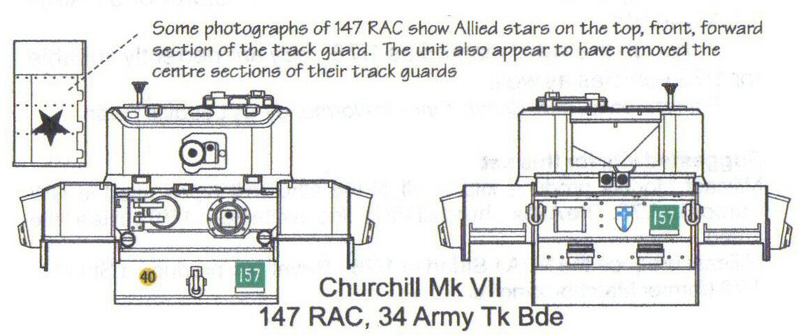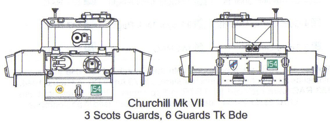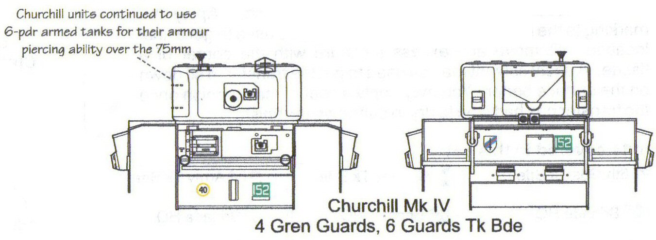 markings, troop numbers or WD numbers. A note explains why : British tanks often show a widespread use of camouflage netting, with or without the hessian tapes. If this wasn’t enough, early in the campaign, Churchill tanks often were up armoured with track lengths (taken also from other tank types, mostly Shermans) fixed or welded to the turret and on the hull, hiding most of the markings. The dust and the mud (sometimes smeared to hide the bright colours of the badge) completed the job which is why it is often difficult to identify a tank (if not impossible). |