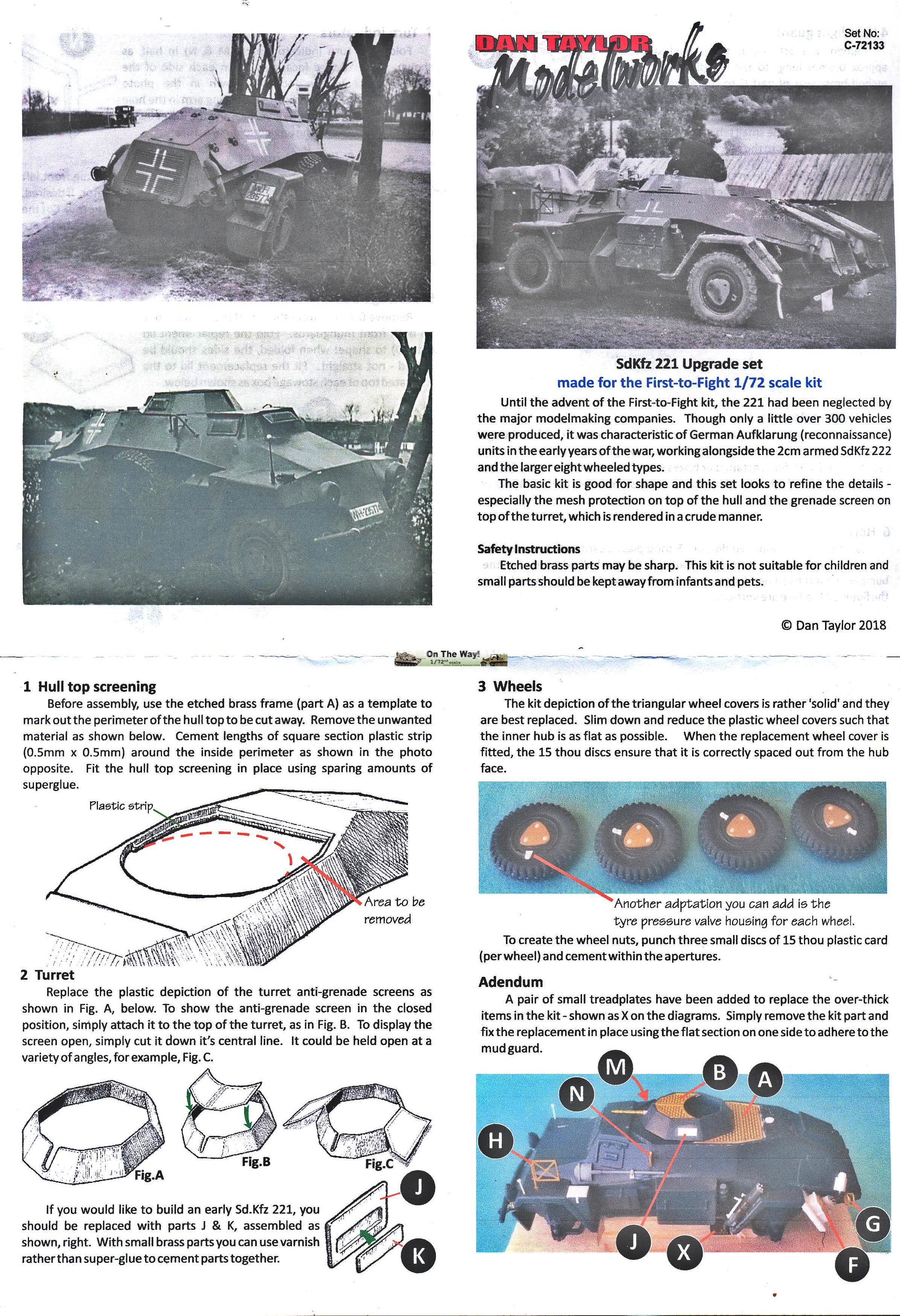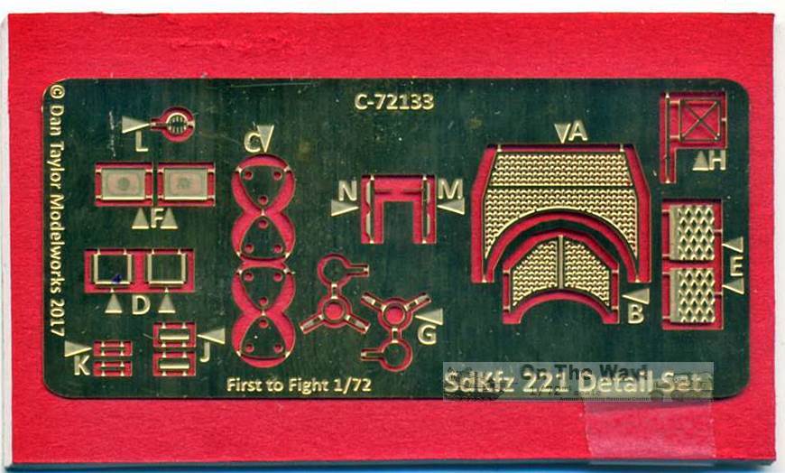 Recently, First to Fight released a kit of a long neglected vehicle, the SdKfz221. I immediately started building the kit, but found myself unable to live with the closed meshes for the engine and the turret. Diligently, I started drilling out all the holes, a few each day, to keep my sanity. I got about halfway through the process when Dan Taylor released this set, which solved the issue in a single stroke (and made all my work in vain). As I will be using the set straight away, I will keep my appraisal in this preview very short. All parts are very well rendered, and apart from the already mentioned meshes, the modeler gets visors for the turret sides, covers and pressure valves for the wheels, treadplates, light guards, licence plates, turn indicators, stowage box lids, a horn and a pennant holder. This should be more than enough to give the FtF kit a thorough facelift. Preview sample purchased by author.