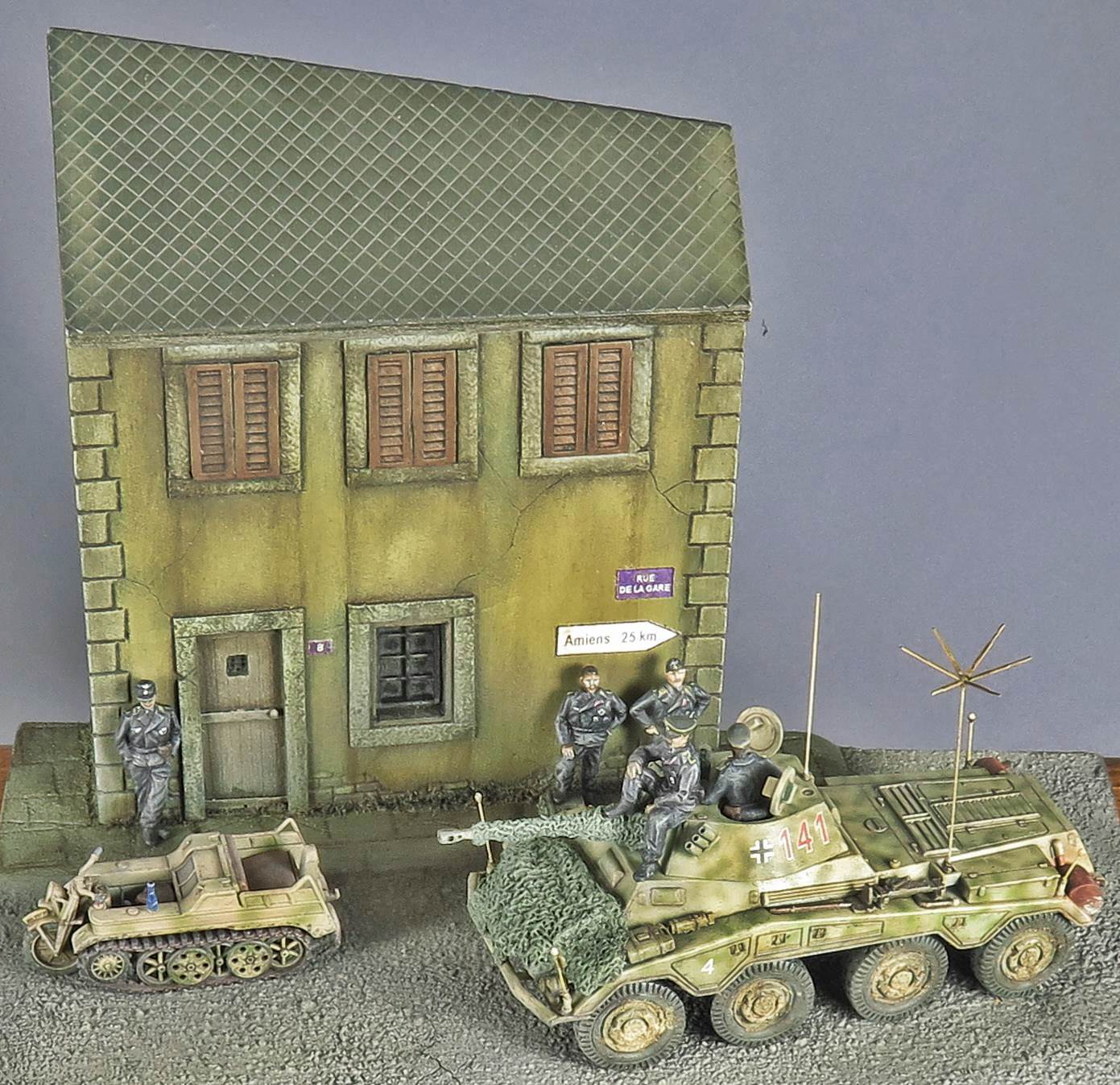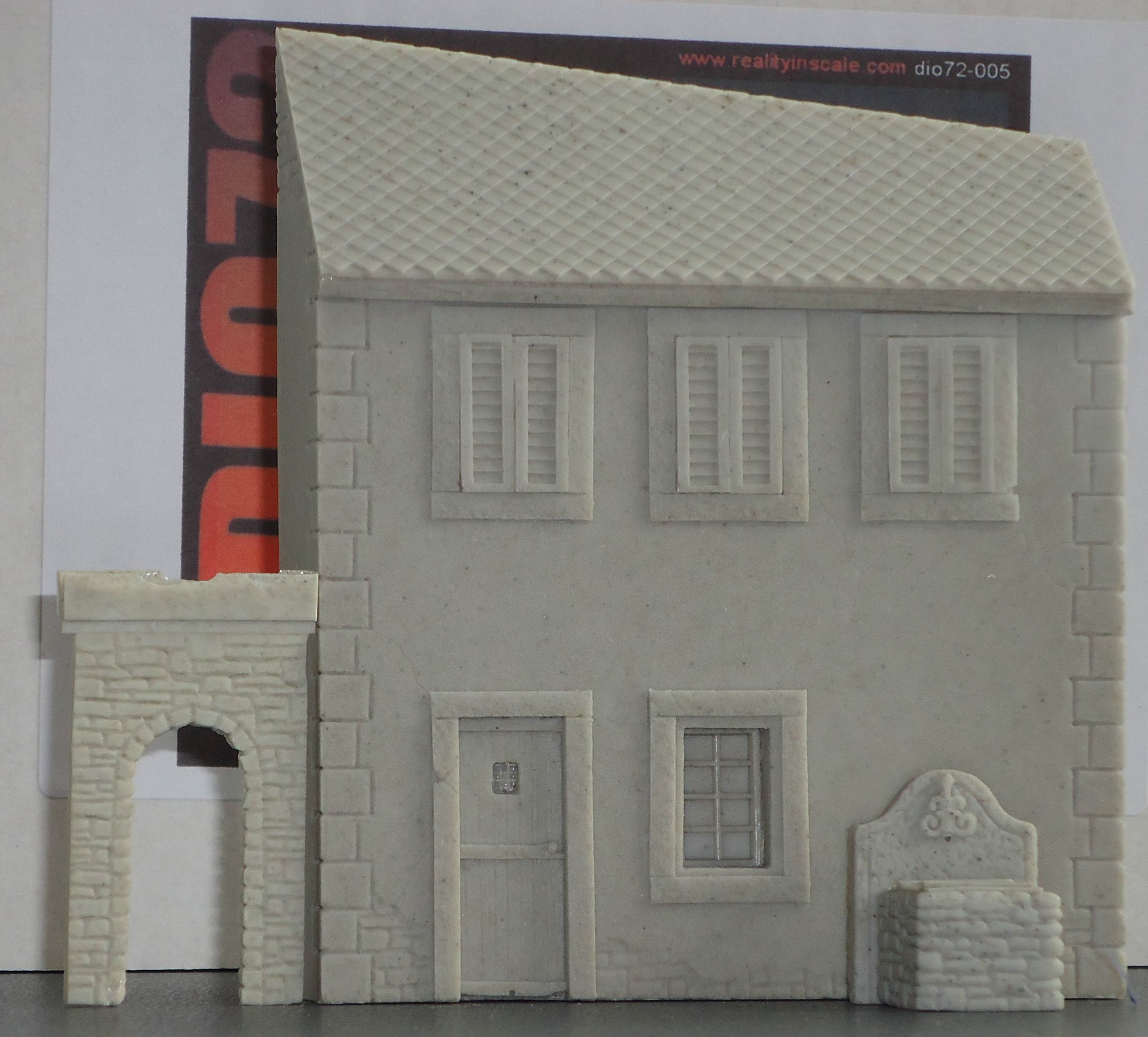 theatres of World War II. The set contains 3 pieces, cast in grey resin, plus a decal poster and a piece of copper tubing, meant to be used for the small fountain. The decal, representing an advertisement for a well-known brand of tyres, will have to be cut in two to fit the wall. This means you can recover the other half for another project. It seems Reality in Scale is using resin casting technology that is state of the art, as - even though the main part is a massive block - no warping is present on the parts, no air bubbles were found (on the backside) and detail is very crisp. Apart from removing a single casting block on the arched gate, there will be no clean-up required whatsoever, meaning that, after priming, painting can start straightaway. The fountain
