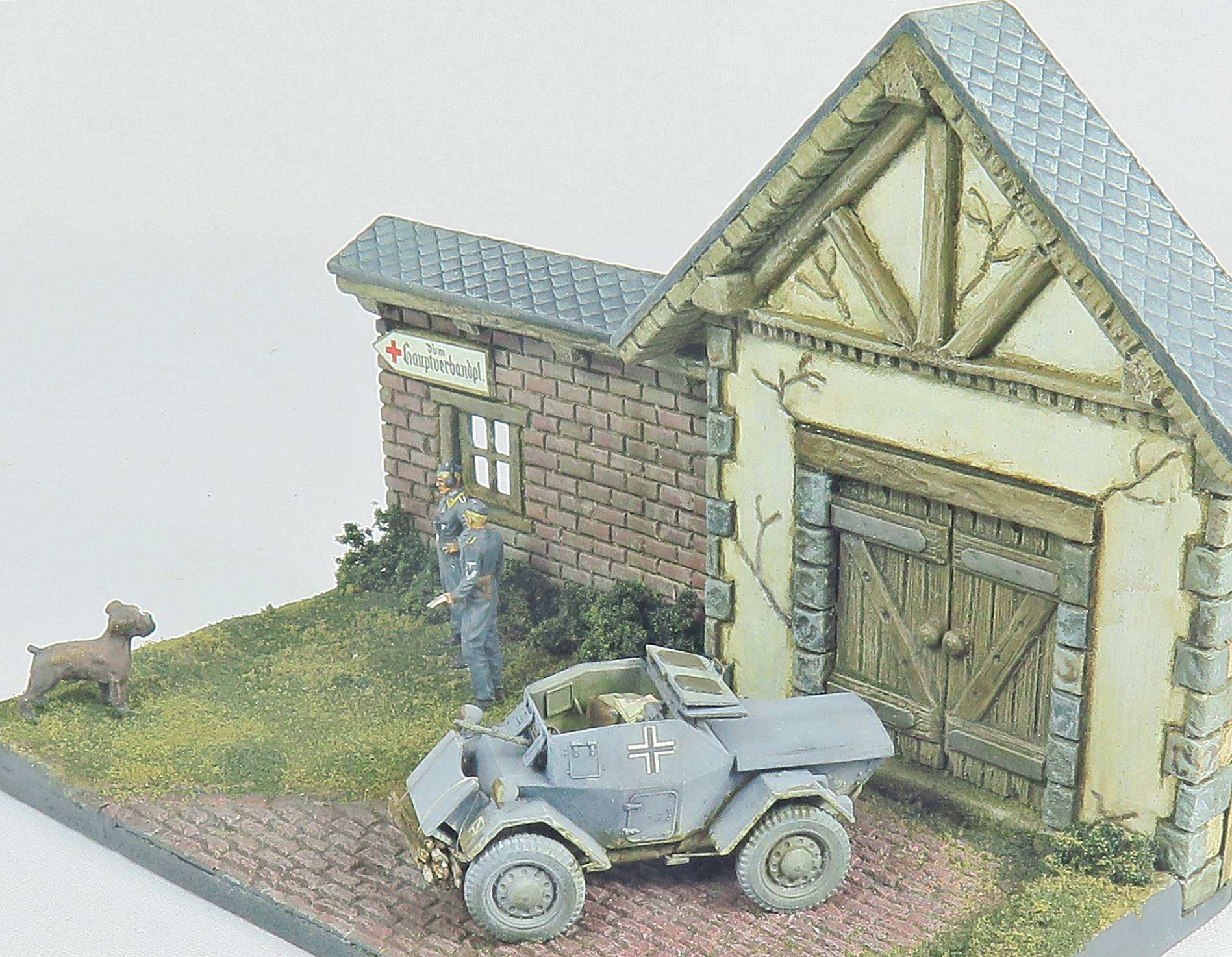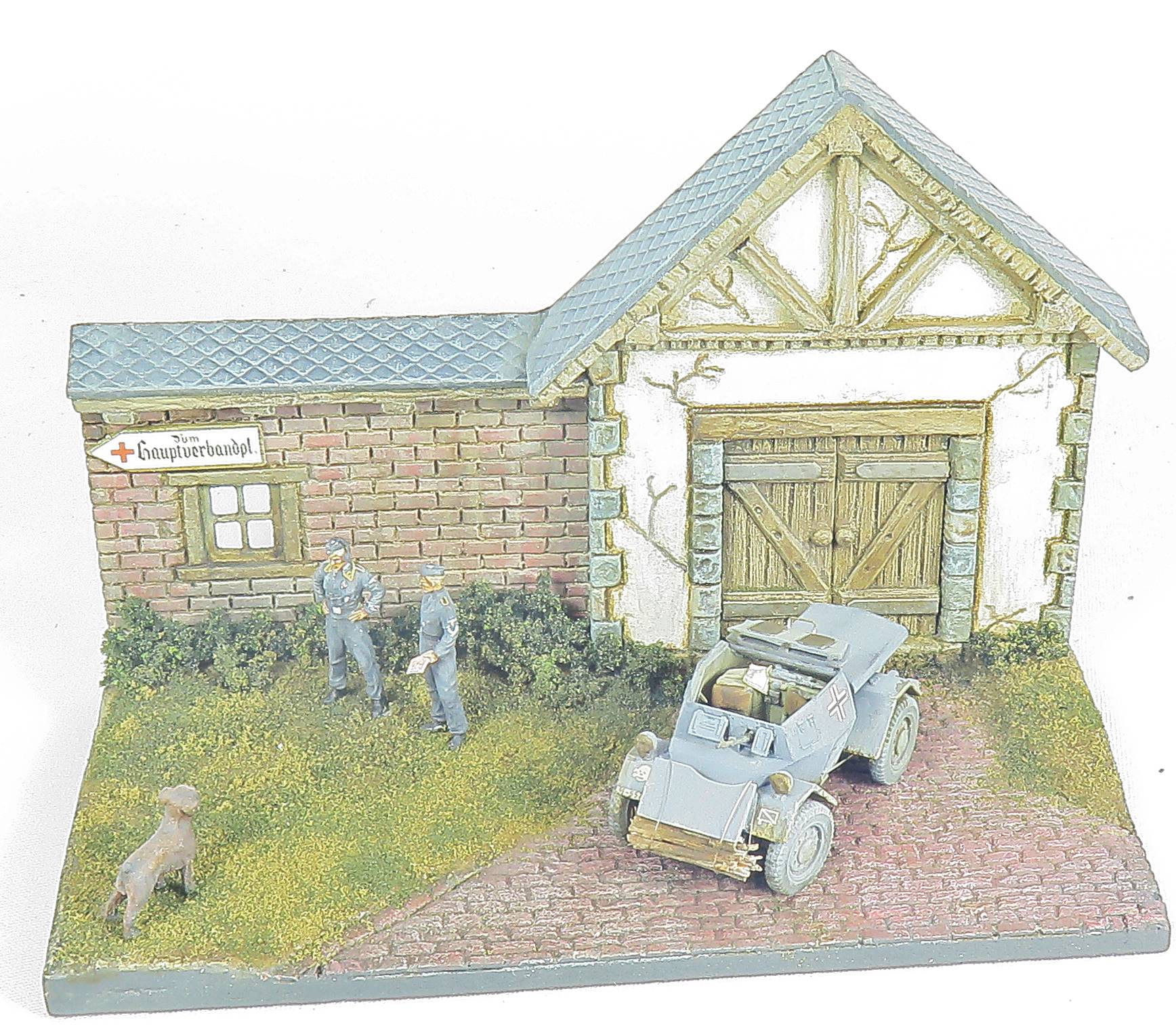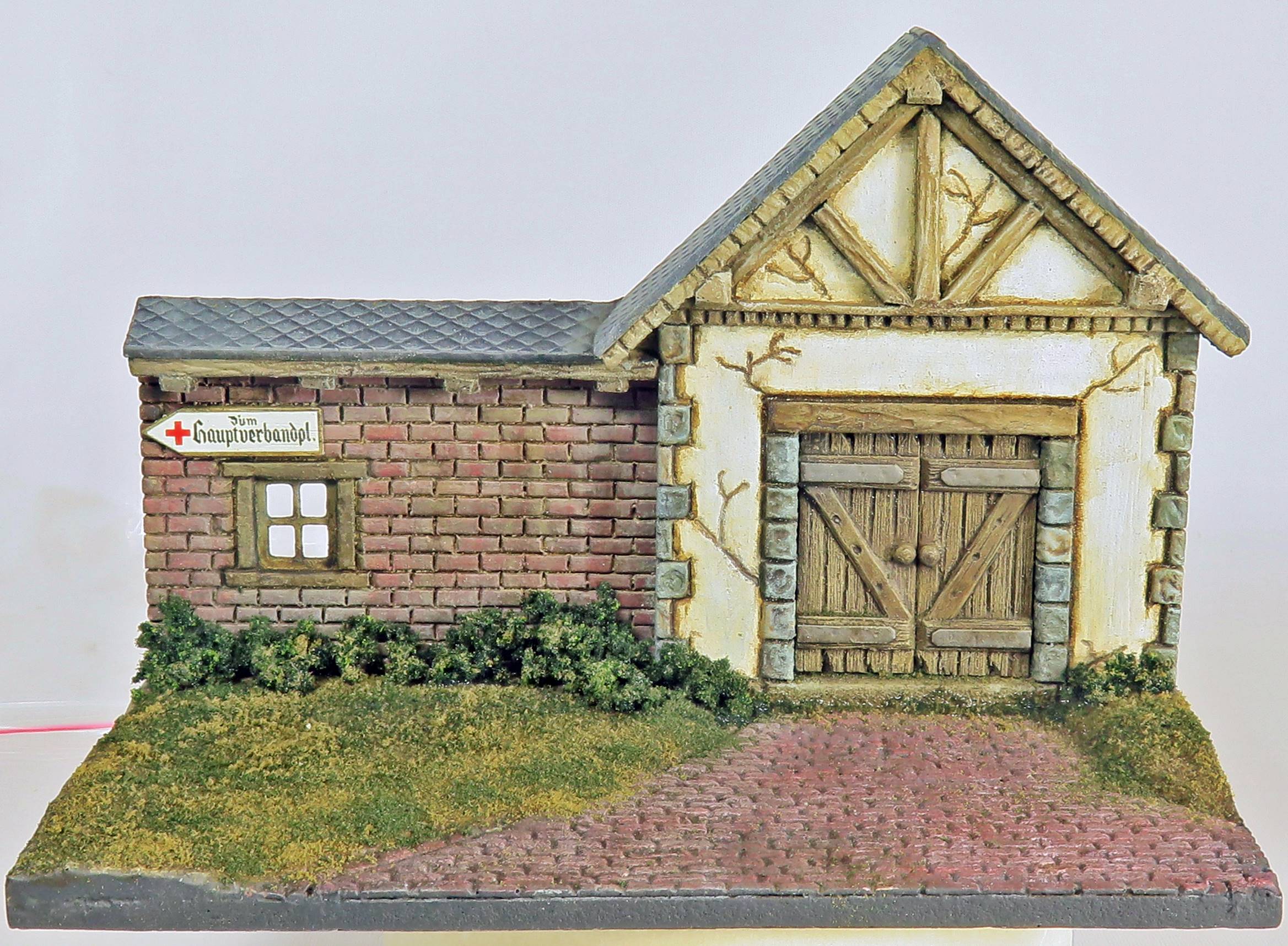 This set represents the front wall of a barn with mixed construction (timber frame and bricks) which would be typical for central Europe. Inside the sturdy cardboard box you will find two main parts of resin and two smaller parts for the doors. Despite the size of the parts, casting is as good as perfect, with some minor flash to be cleaned up.