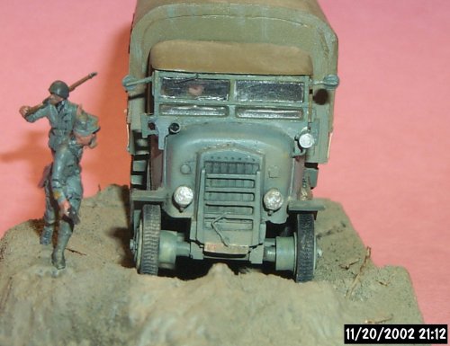 The truck bed (part 5 the body) has a good texture of wood boards. If you wish the rear tarp open to view the bed I recommend that you add the inside tarp frames that hold up the tarp. From a WW2 era photo of this truck, I saw that it had a series of slats under the tarp to create a stiffer, well supported cover.
