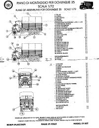 The scan above of DOC's Dovunque 35 shows the 15 injection-molded, light amber resin parts, 12 soft rubber tires, and about 12 white metal (iniezione in Italian) parts. The truck frame and bed are at the right. The tarp, or canvas, for the bed is at the lower left corner. The decals for three vehicles are at the top left. [You will note above that there are actually two truck frames shown; my kit originally came with two frames and none of the white metal parts supposed to be there. DOC promptly and graciously shipped me the missing parts after I e-mailed them.]