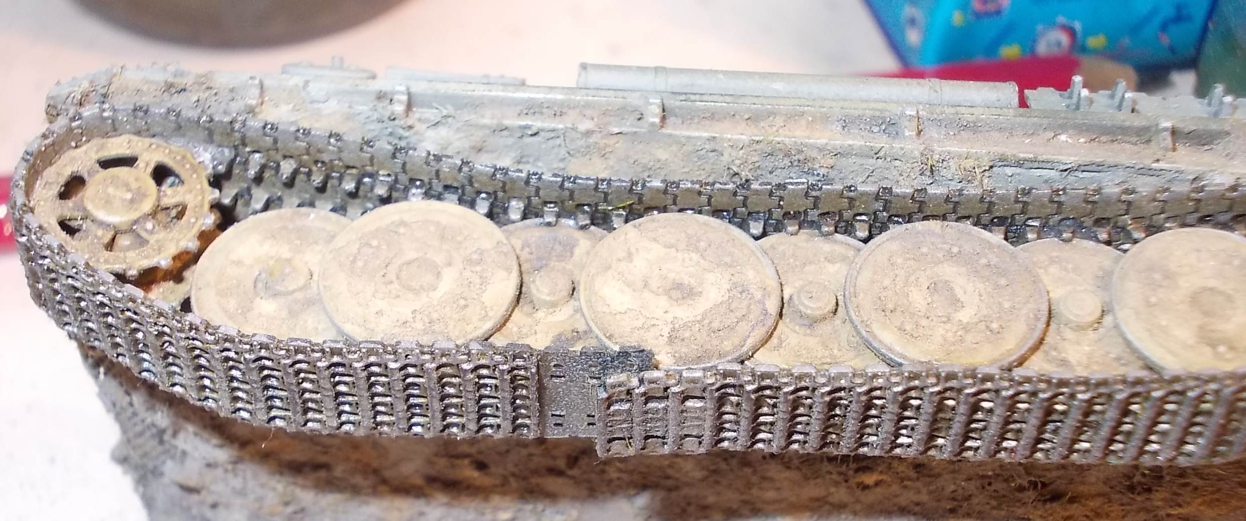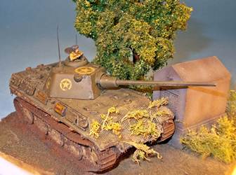 fatigue ? I could go on rambling about some other minor shortcomings of the kit, but I believe I have made myself clear by now. The kit is not a complete disaster, assuming it won't disintegrate in a couple of months, but it is typical of a new brand's first efforts, as it was at the time of this release. I am pretty sure the newer Panther kits from Dragon will be infinitely better (and more expensive). I didn't try the kit decals, as I decided to go for a "what-if" paint-job. The figure in the picture is from Milicast set n°5 (yet to painted), the stars are spray-painted using Stencilit and the decals are from Peddinghaus. In the picture aboven the tracks still need to be integrated with the dio I am preparing (which will help hide the gap). I added "chicken wire" to the front glacis to hide the ill-fitting hull. Foliage still needs to be added; dried plants will beu sed for this. The diorama