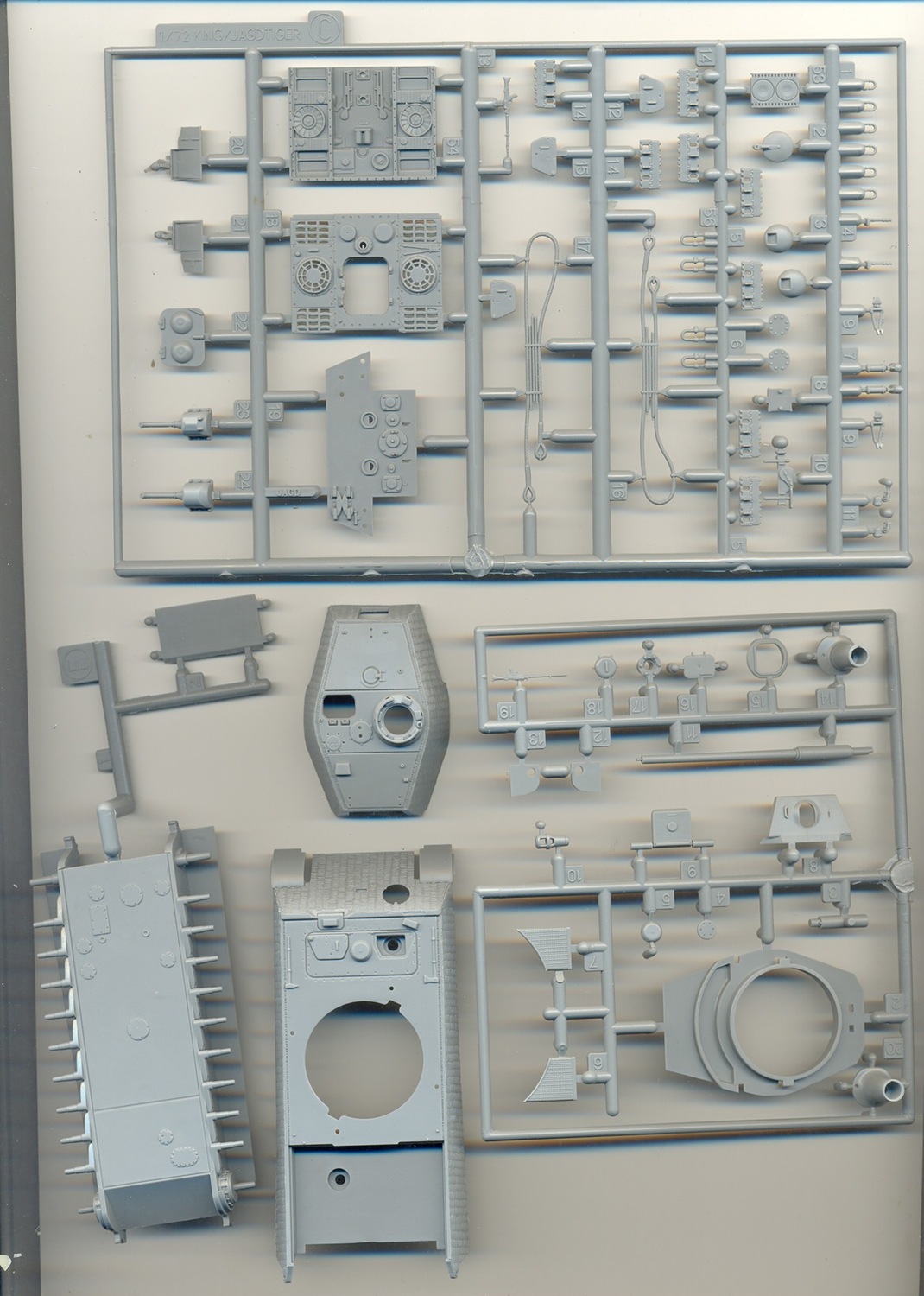 are specific to the Zimmerited kit: The fenders ought to have been the same as in kit 7246, but are not. In my kit they were clearly marked "JAGD", and are too long. Obviously someone put the parts of the Jagdtiger kit into this box. (The fenders in kit 7246 that Doug Chaltry reviewed were marked "KING".) Well, it's better than the other way around and it's not that difficult, I guess, to cut off a centimeter or so from the last section of the fenders. The PE fret is obviously the same as in kit 7246, as it is marked as such. It's very nicely done.