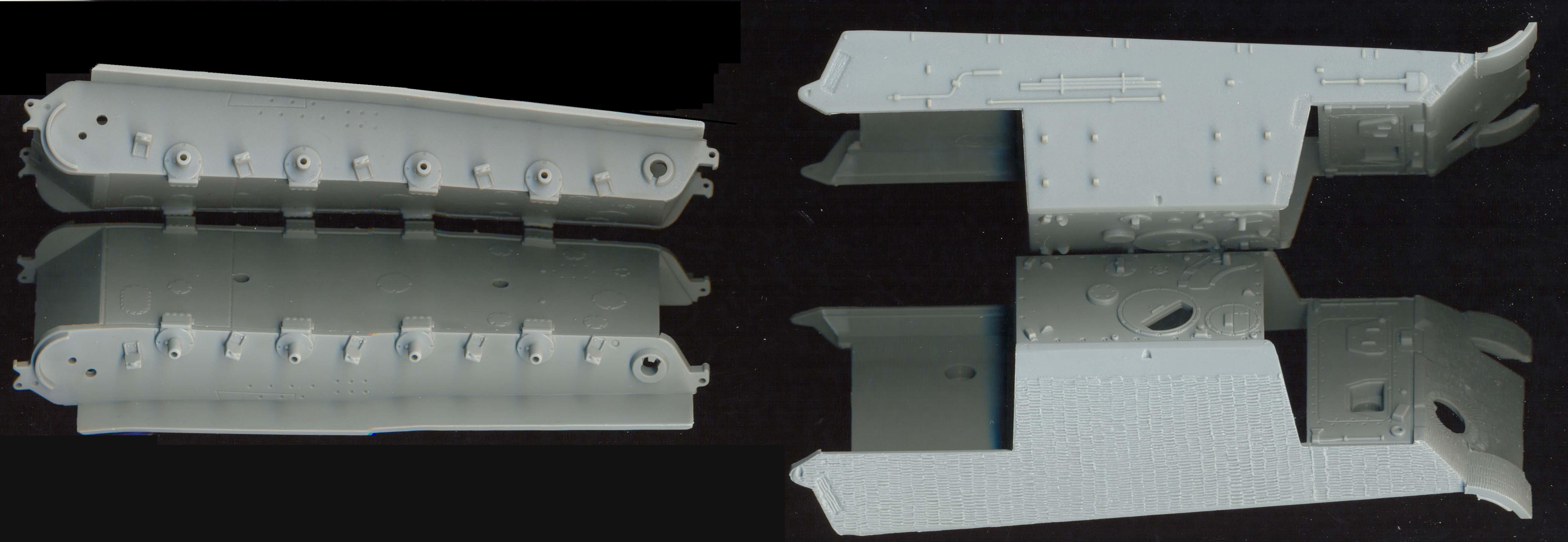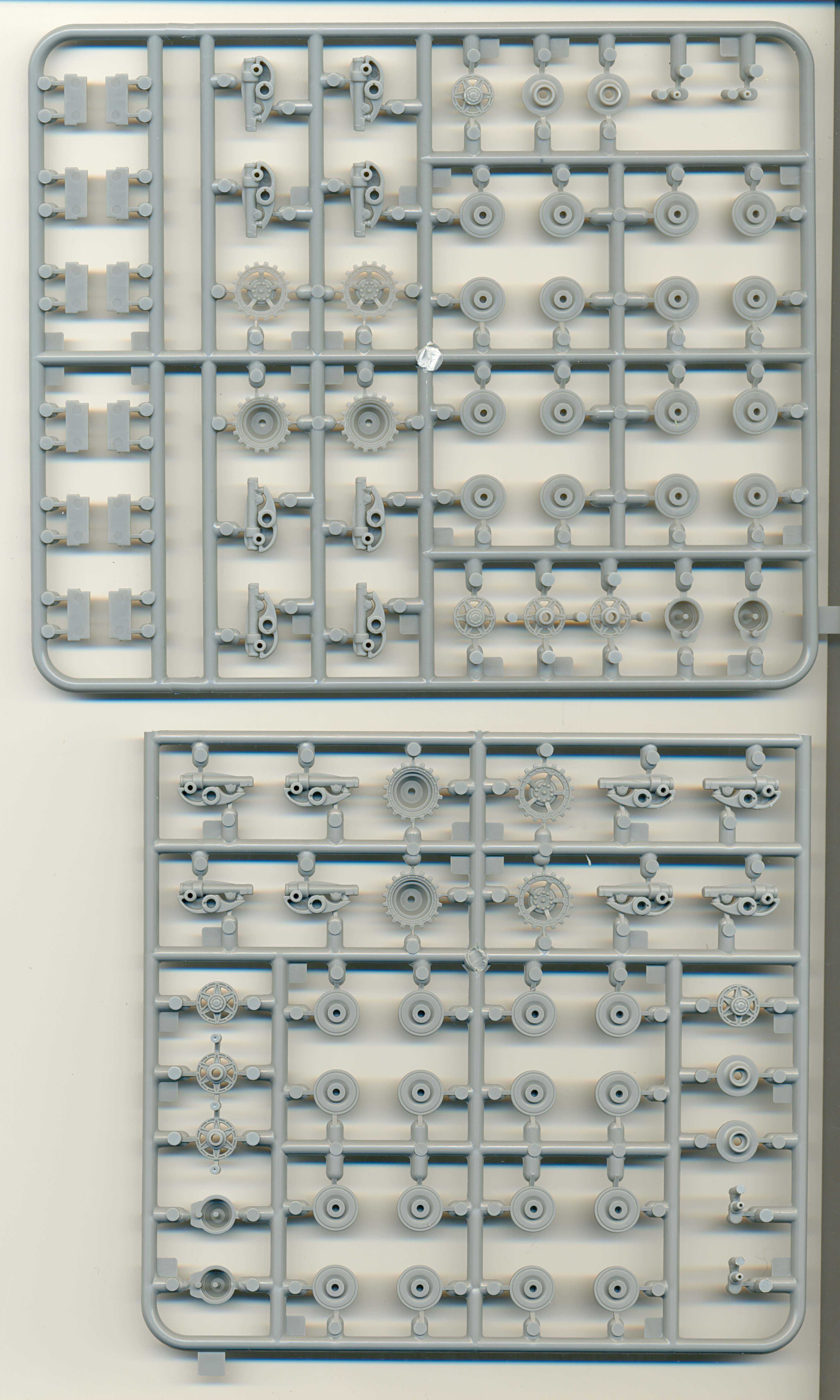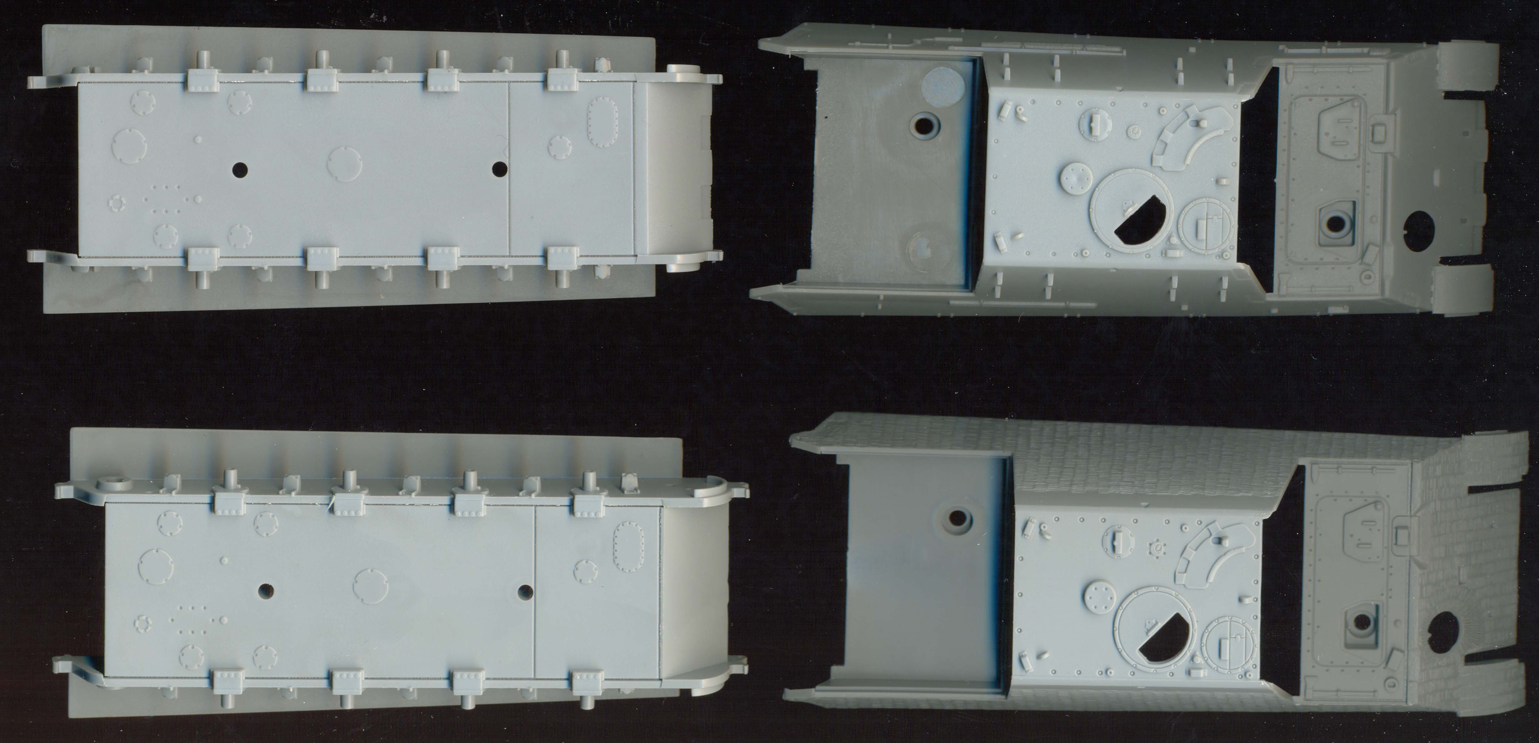 1. The parts The upper hull of 7291 is notably sharper than that of 7250, has Zimmerit, but no attachments for spare tracks or tools on the hull sides. The tools that are molded on the hull of kit 7250 are not provided as spare parts in 7291 either. The lower hulls apparently only differ in the extra notch for the idler that has been added to kit 7291, but for no apparent reason. Both hulls have holes in the bottom which are presumably for the ready-built kits. The driver's hatch is closed, but there is a spare hatch "not for use" in the kit, in case you like to do some surgery. The four crane mounting Pilze on the