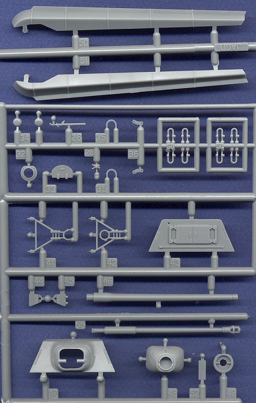 ![]() Although this is not the first Jagdtiger kit made in this scale, it is the first one with the Porsche suspension. There were originally two prototype Jagdtigers built in February 1944, one with a suspension by Porsche, and the other with a suspension by Henschel. The first 10 production vehicles were equipped with the Porsche suspension, but then production switched over in September 1944 to the Henschel suspension for the remaining 73 vehicles built. Other Jagdtigers in this scale include a plastic kit from ESCI (soon to be released by Italeri), a resin conversion by Al.By meant for use on the ESCI kit, and recently a new complete resin kit from MR Models. All of those other kits have the Henschel suspension. This new kit from Dragon is a very fine model with only a few weak points. As with many of their earlier kits, this one was once a die-cast toy, but here, the metal hull has instead been cast in plastic like the rest of the kit. The detail on the hull is quite good, although the driver's hatch is molded closed. I wonder, if they wanted to mold only one front crew hatch open, why wouldn't it have been the driver's? Regardless, several spare hatches are included, so we can open the driver's hatch if we so choose. The commander's hatch is open, but the loading hatch on the rear of the superstructure is molded closed, and detailed on the inside for some reason. I think this hatch was originally supposed to be open, but they decided to close it with hatches that had already been detailed on the inside and out. Opening these doors will take major surgery. The three crane mounting sockets (pilze) on the roof need to be removed, as they were seen only on the Henschel vehicles. Most of the pioneer tools are molded into the hull, but some of them are separate. As with their King Tiger kits, Dragon includes many optional parts with this Jagdtiger, which will provide plenty of spare parts for other projects, including an extra 88mm gun barrel (this was used on a very small number of the final Henschel version vehicles). The gun travel lock is provided in both traveling and firing positions, and an anti-aircraft machinegun mount is included for installation in the engine deck, though I believe that this machinegun was only added to the later Henschel versions of this tank hunter, not this Porsche version. Like the other Dragon Tiger kits, this one includes a flat engine insert for under the engine deck. The engine access hatch is molded open, so if one wanted to add a completely detailed engine compartment, it would be easy to do so. In fact, the following sprue of parts is the same as included with the King Tiger kits, so that there are many spare parts included here. Regarding zimmerit, I believe the prototype vehicles lacked this protective coating, but all production Porsche vehicles should probably have zimmerit applied. They stopped applying this coating at the factory in September of 1944, which is the same month that they switched to building vehicles with the Henschel suspension, so it's likely that few, if any (other than the prototype) Porsche Jagdtagers were without zimmerit. Similarly, I don't think that any of the Henschel vehicles had zimmerit applied. The wheels are very detailed, and I think they look fantastic. Wheel suspension arms are included as separate parts, and not molded directly to the hull, which will make it easy to articlulate the wheels, and represent the vehicle traversing rough terrain. The sprocket wheel has the correct numberof teeth (18), though again, they switched over to the 9-tooth wheel and new tracks in September, so it's possible that there may have been a couple of Porsche Jagdtigers with the later sprocket and tracks, though I doubt it.
