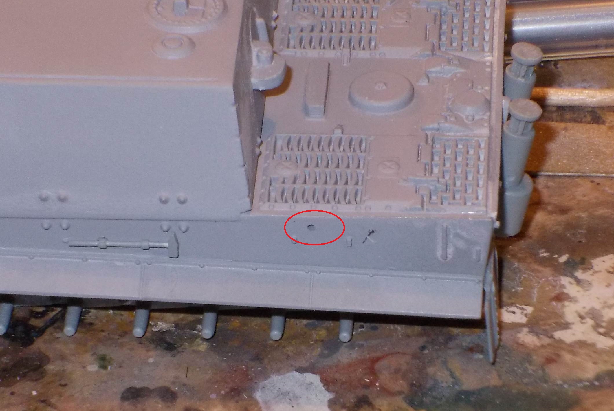 In general, detail is rather soft, heavy and minimal. Notable examples are the track hangers (?) on the side of the hull, which I didn't install. If these were to scale, they could be used to suspend a complete Tiger, not just some tracks. There is a hole in the side of the hull (left side, to the rear) that seems spurious to me, as nothing needs to be fitted there. Conversely, there are no locating holes for the jack. The sheet covers for the exhaust are in brass. They fit rather badly and are handed. The manual would lead me to believe that left and right side are the same, which they aren't. The tracks