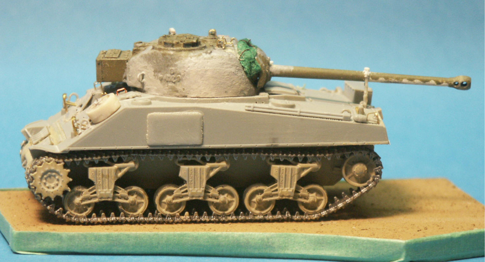 A light tan paint was sprayed over the base and up onto the lower hull, after which I attached browned static grass to the base with white glue to represent a dry late summer field in Italy. Looking at the vertical volute spring suspension (VVSS) bogies makes me think how the detail of the bogies are so often ignored during assembly and reviews, I have done it too. We'll make sure there are exactly 24 bolts around a certain roadwheel and that the kit is exactly 1/72 scale, but it seems like Sherman bogies are just ignored in resignation. For example, take these DML VVSS bogies here, the nice looking stamped type roadwheels are moulded rigid onto the rocker arms and on all the wheels the grease plugs are located in the same orientation of about 12 o'clock. The bracket holding the return roller appears to be an intermediate style with a straight bracket and no raised roller, but the bracket looks significantly too short in the horizontal direction. The bogies just look too big in relation to the size of the sprocket wheel.