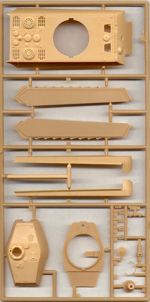 This kit comes with fewer parts than the new Revell kit, but the level of detail is still remarkable. But there are a few notable absences, such as pioneer tools. There are some spare track links for mounting on the turret sides, and unlike the tracks that are to be installed on the wheels, these spare links are very good. Side skirts are provided separately, but molded as a single unit per side, so that you would have to do some surgery to remove single plates.