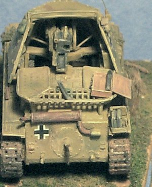 My model above was detailed with a grab-bar above the gun compartment, scratchbuilt ammunition boxes, and I hollowed out the recoil slide under the breach.