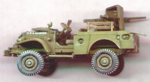 A beautifully detailed model, and a very simple kit to build. This kit is based on the US 3/4 ton Light Truck WC 51 kit. Like that kit, this one has a very detailed suspension, excellent driving compartment, and well detailed flatbed. This GMC (Gun Motor Carraige) kit contains a different flatbed for the 37mm anti tank gun mounted in the rear. It has ammunition storage bins with positional covers, the windshield can be positioned up or down (but no clear plastic is included), a winch is included for the front bumper, and plenty of stowage for the outside, such as tools, gas cans and bedrolls.