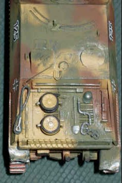 The major complaint about the L/70 kit was the incorrect exhaust system; I left off the large tank as suggested in the article and added the two vertical exhausts of Revell's kit. I repositioned the machinegun port slightly upwards, but unfortunately I broke it with my scalpel so I had to build a new one. Be careful when working in that area, because it is the most eye-catching. In addition to that, the pioneer tools and spare bogies and tracks have been added to the backside of the vehicle. I hope their mounting is nearly accurate for a late version JgdPz IV.