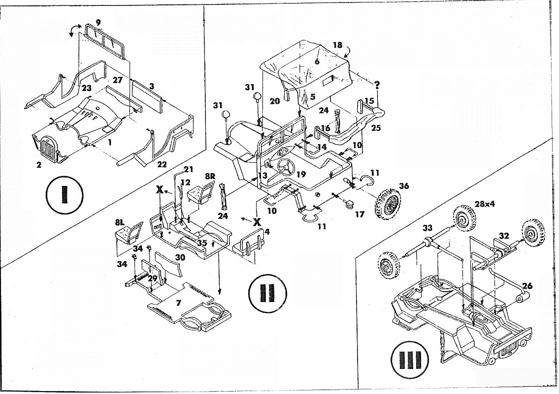 Detail is quite nice. Kit has 49 parts which are molded in a softish light grey plastic and spread over two sprues. There is some flash and a few seams to remove from most of the parts. Also there is a bit of roughness to the castings that will force you to sand some of the body panels to get a smoother finish. The wheels/tires are little jems. You get the option of a folded or deployed cover (part 6) for the interior. The deployed version is well done dut suffers from the same fate as all others that I have seen - the inside surface has not folds or creases. There are no decals and a small instructions sheet. The instructions are a three step affair of exploded diagrams showing how all the parts go together. The diagrams are reasonably easy to follow though a bit vague in a few spots. The sprues have the name Colibri cast onto them. I'm not familiar with Colibri but a browse through the OTW manufacturers page seems to indicate that Colibri, Fort, Komintern and MGD are all inter-related. Do step 1 as per the instructions. Watch the placement of the instrument panel (part 27) and make sure that it sits up high enough to be level with the bottom of the holes for the windshield pivots. Not doing this will produce a gap between the window frame and the body which is what happened to me. In the end this didn't affect me much as I had already decided to mount the windshield in the folded position and the cover I added over top of the frame filled the space nicely. For step 2 I found the following build sequence made construction easier: