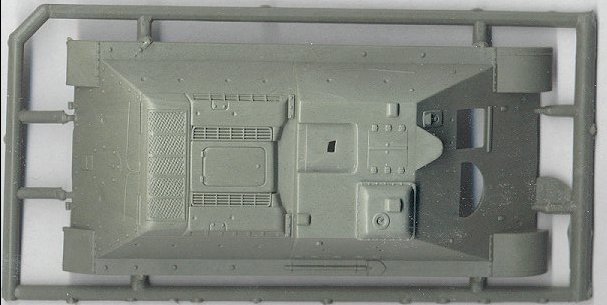 The above scan shows the hull bottom, which also includes the 85mm gun for the SU-85. The remainder of the SU-85 gun mantle is provided on the wheel sprue below. The wheels are the early, sold disk, rubber tire style, and although the hubs are not pronounced enough, I feel that these are better wheels than those included in the ESCI T-34/76 Model 1942 kit. They have very good bolt detail around the rims, and the perforated rubber tires are very good.