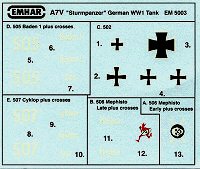 The decals are fairly comprehensive, with several marking options. I remember that the decals in the Mark IV kit were fairly decent, although they needed some heavy use of decal setting solution to properly snuggle around all the rivet detail. What I find very disappointing is the out-of-register printing of the cross markings. This is a serious problem throughout the small scale AFV industry, and it is really beginning to piss me off. Trying to get the larger scale modelers to take us small scale modelers serious is hard enough. Now when are the manufacturers going to start taking us seriously, and start paying attention to quality control issues such as this? If this was a WW II German tank, I wouldn't complain as loudly, since we now have several sources for replacement decals; but where are we going to find replacement WW I crosses?