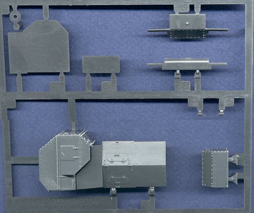![]() OK, so am I the only one who looks at that box top, and thinks that the tank is driving away from the viewer? What a weird looking tank ... But ... the kit is great. For those of you who have seen Emhar's previous A7V, you'll know what to expect with this model. It is an extremely simple kit with few parts, but the detail molded onto these parts is fantastic. Even the tracks are nicely done for a change. Although they are molded onto the kit, they look great. The hull is made up of several oddly-shaped pieces, as you can see below, but it looks as though it will go together quite easily.