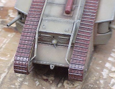 I finally got my camera fixed so that I can post this review. I built this model a couple of years ago, and I have absolutely no references on World War I tanks, so I cannot comment on the scale or detail accuracy of this kit. According to the dimensions included in the instruction sheet, it scales out exactly to 1/72nd. Emhar produces only two 1/72nd scale armor kits, this one, and the closely related Mark IV "Female" tank. The "Male" is armed with a pair of 6-pounder cannons in the side sponsons, and three Lewis water-cooled, or Hotchkiss air-cooled machineguns, while the "Female" is armed only with machineguns.
