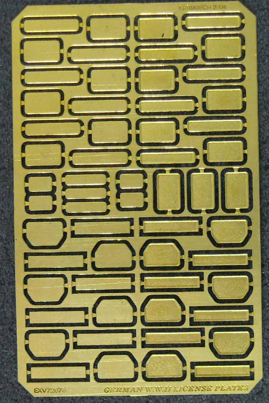 This set contains various types of front and rear licence plates as used on German vehicles, other than tanks. Worthy of notice is that some of the styles come in two variants: with or without beaded edge, which is a nice touch. Overall this set is very nicely done, and appears to scale. Also note that on a lot of vehicles the licence plate numbers were painted on the hull, instead of on separate plates; this is especially the case for the front licence plate. |