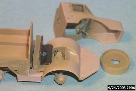 The brass parts were clearly marked, and bent into shape well. A clear film backs the etched-brass dashboard with the dial markings on the film. Visibility into the cab is difficult when done; I should have saved this piece for an open-top truck where it could be better seen!