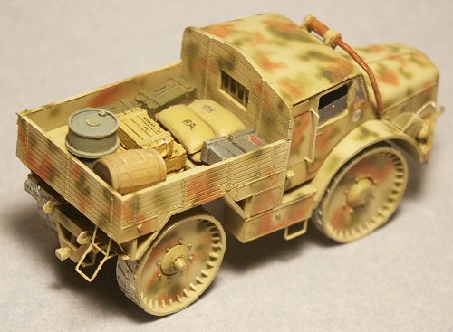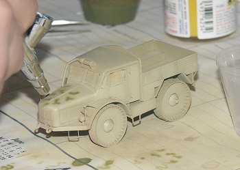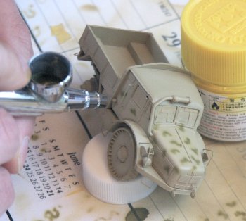 After washing and allowing drying the clear windows were masked with Tamiya masking tape. The Tamiya Panzer Yellow and Buff acrylic paint colors were blended to achieve a good scale-effect color and thinned with alcohol to a consistency of milk. With 15 psig on the regulator three very light coats of paint were applied, waiting about five minutes drying time between coats. At this stage its important to hold the airbrush close (about 2 to 4 cm maximum) so the paint does not dry in the air and form a rough spotty, orange-peal like surface.