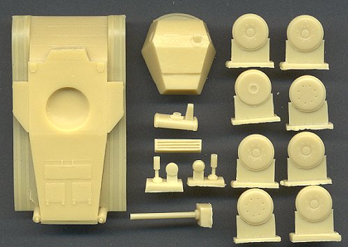 I've already removed the resin blocks from the turret bottom and hull front, as well as the gun mantle. As you can see, everything is molded quite cleanly, with excellent detail, and no imperfections. My only complaints are the lack of rivets on the hull and turret, and the wheels could have been a bit thicker. As can be clearly seen on the box cover photo, the center part of the wheels was very convex, with very pronounced bolt heads. The bolts are present here, though they are a little subdued, and the wheels are a bit too thin, but it shouldn't be too noticeable on the completed model. Being a solid body kit, all hatches are molded shut.