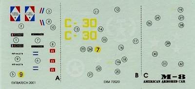 Markings are included for three cars. I've adjusted the contrast and brightness of the decal image, so that the white would show up on the screen; the actual decals are much higher quality than they appear here. They are very thin, and printed in register.