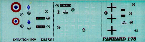 The decal sheet is very comprehensive, with markings for three versions: one French, and two captured German. The decals are very thin, and printed in register. The actual decals look better than the above scan, because I had to alter the contrast and brightness to get the white to show up.