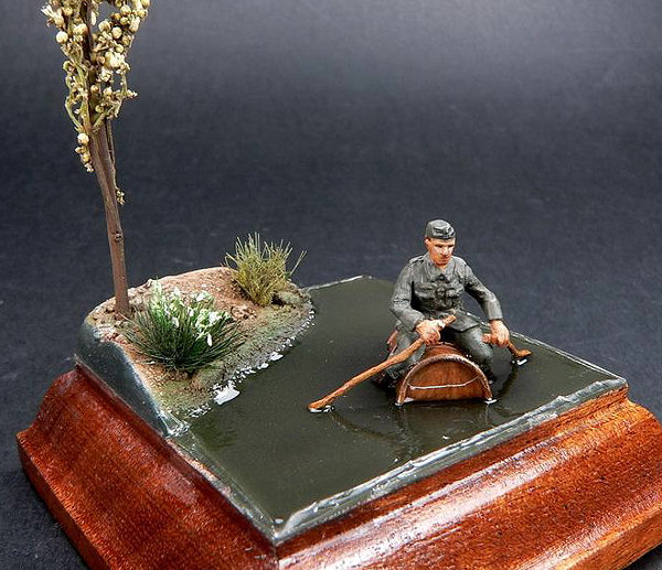 Packaging: Small sealed plastic bag. 2. Type of kit: Micro-vignette based on an original wartime picture. Very limited production run. 3. Quality: Casting quality is very good, with small parts on a thin carrier film (as usual for resin kits). Minimal clean-up is to be expected. 4. Contents The set consists of one resin piece of a soldier on (half of) a barrel and two "ersatz" oars (actually wooden sticks), also in resin. The diorama base is not included. 5. Instruction sheet: Nihil, except for a B/W picture of the original soldier on his barrel. 6. Decals and painting options: Nihil. 7. General Impression: Very good and very original. 8. References Nihil, except for the original picture of the soldier found on the FBMinis weblog.