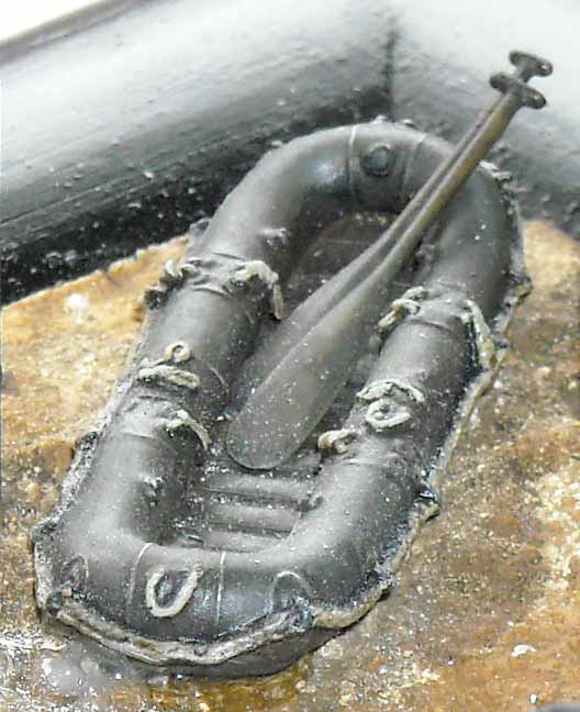 ![]() Picture by FBMinis, used with permission 1. Packaging: Small sealed plastic bag. 2. Type of kit: Stand alone resin kit. Very limited production run. 3. Quality: Casting quality is very good with nice detail; small parts on a sprue. 4. Contents The set consists of two rubber assault boats and four oars, all in resin. 5. Instruction sheet: Nihil. (Not really necessary either.) The boat respresents a "Kleine Flossack 34". 6. Decals and painting options: Nihil. 7. General Impression: Very good. With enough of