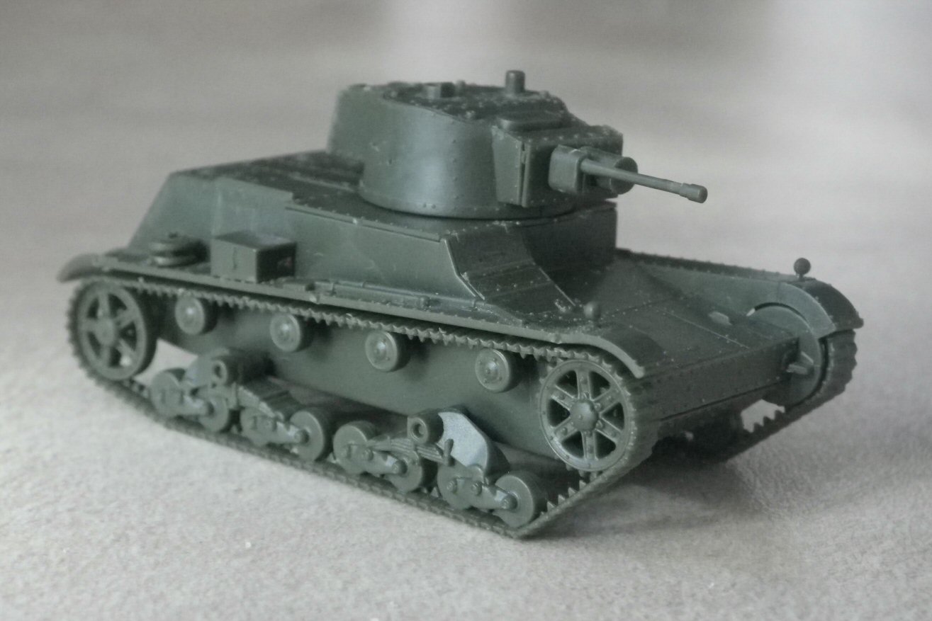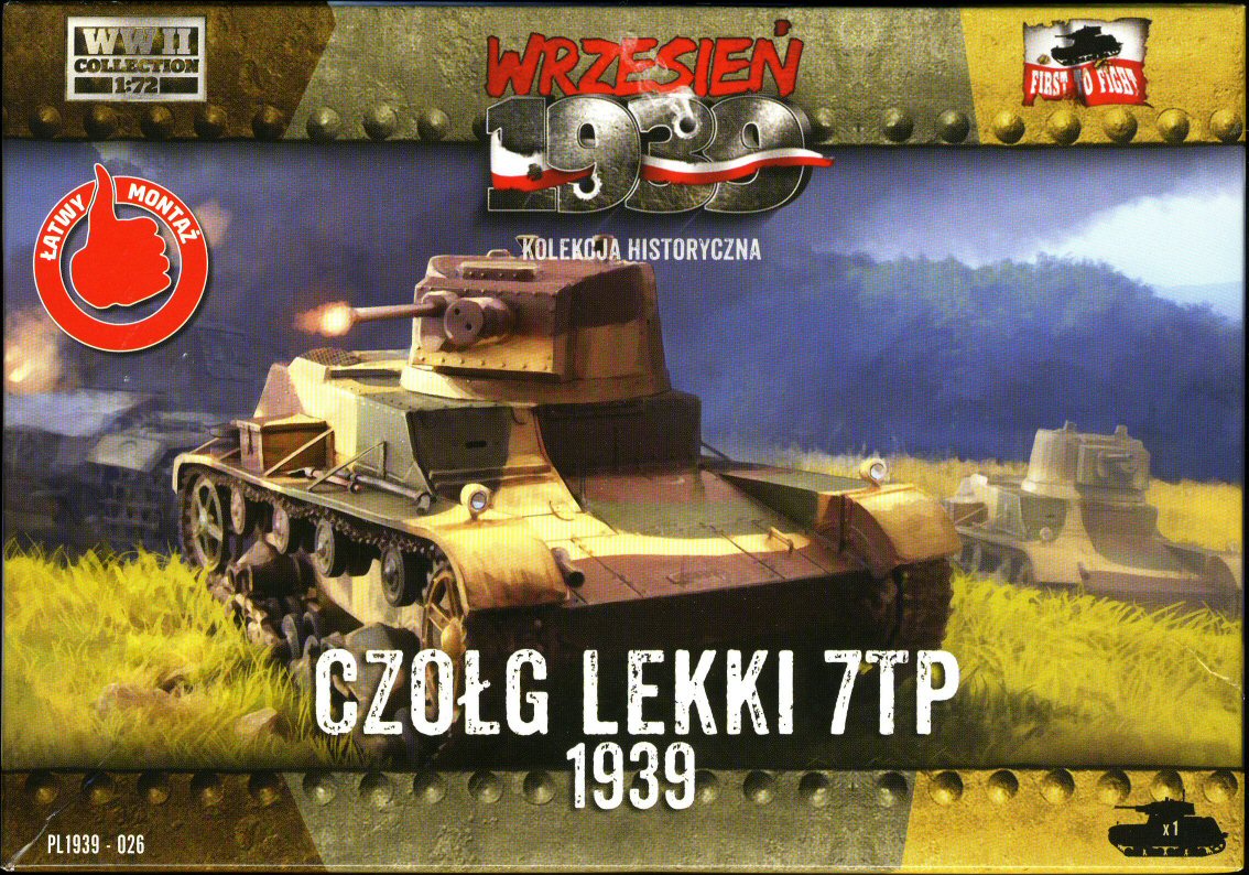 The 7TP was the best Polish tank in the 1939 campaign, and one of the symbols of the pre-war Polish Army. The ultimate and most numerous variant was the single-turret version, with 37 mm Bofors gun. You can read more about its development and combat use on my page. First to Fight's kit of the single-turret 7TP appeared in 2015. It should be noted that this kit represents the less numerous early production single-turret tank, differing from the main series in a low-mounted muffler and horizontal shutters in the rear plate instead of armoured doors. (It shared the hull with the initial twin-turret version.) Such decision is justified by the desire of parts' unification with a twin-turret model, but the result is a relatively rare version (probably no more, than 18 tanks). Of course, the difference is negligible, if you need just a generic single-turret 7TP.