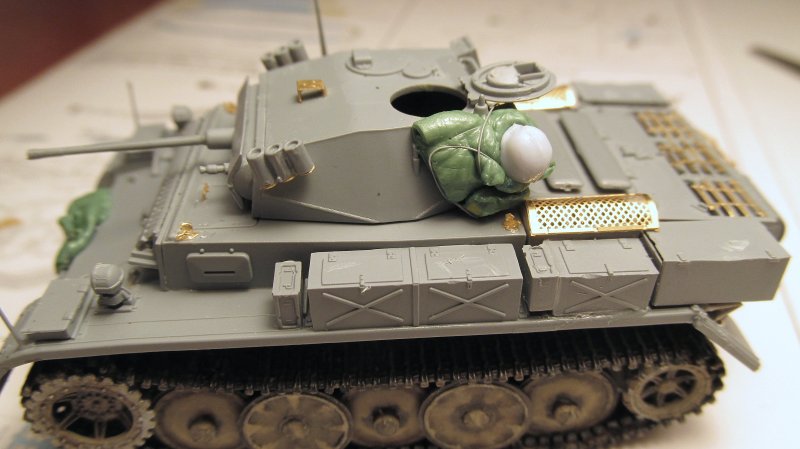 There is a number of PE sub-assemblies conveniently pictured in separate squares in the instructions, with PE parts identified in cyan color. It must be said that some can be left where they are because there are plastic equivalents already in place (the four lifting hooks in the hull - PE 4/5 - and the handles on the front hatches - PE 11), but most of them can not be avoided, or the final model will look rather fast-build and not very similar to the real vehicle. In case you want to use the PE parts in place of the plastic ones, the latter have to be carefully removed with a scalpel, to avoid destroying details or leaving scratches, then each PE part has to be bent and positioned. For example, in the first one of the following pictures you can see the plastic handle of the hatch still in place, while in the last picture you can see the definitive PE ones, along with PE hooks and electric wires for the front lights. Since the vast majority of the kit is identical to the previous one already built by Rob Haelterman, I am not going to repeat all the details he pointed out already. As a general suggestion, I would only repeat that the kit is perfectly engineered, but it is so finely crafted that every single piece needs a special attention, so an extreme care is needed when separating pieces from the sprue and when cleaning them before glueing them together. Also, follow the instructions very carefully because many pieces might look identical while being different - the rule of thumb, as stupid as it might sound, is that if they have different numbers, they are, well, different. A particular note of merit goes to Flyhawk for not having been lazy and given a single possibility for the set of idler segments to be mounted above the visors: three different combinations are provided instead, from which you can choose, reflecting all possible combinations seen on real pictures. Also, the detail on jerrycans is the best I have ever seen, with separate handles which increase realism to the maximum extent. Other differences between this one and the "early" Luchs previously released by Flyhawk lies in the external stowage, because the position of tools and jerry cans differs somewhat. This naturally means that PE parts to be used in both kits are different too. Talking about PE parts, it seems that the six spokes of the star-shaped antenna (PE-13) should have a more acute angle with the rod than showed in the instructions - see real photos. Assembling hull and wheels is quite straightforward: I am not going to repeat what you can find in the aforementioned review. I would just say that sprocket wheels (K14-15-16-18) should see their two halves firmly inserted to avoid teeth misalignment, yet this does not happen because the squared peg-hole combination is a bit loose, so be careful. Taking your time, in some days of work the model will be complete. I added some extra stowage sculpted from kneadatite/green stuff, trying not to obscure any of the very fine details. When mounting the commander's hatch in open position, I had to fill a very visible ejector hole. You might notice that the width indicators are built from scratch: this is a warning to never mount very fine parts until the very end ...