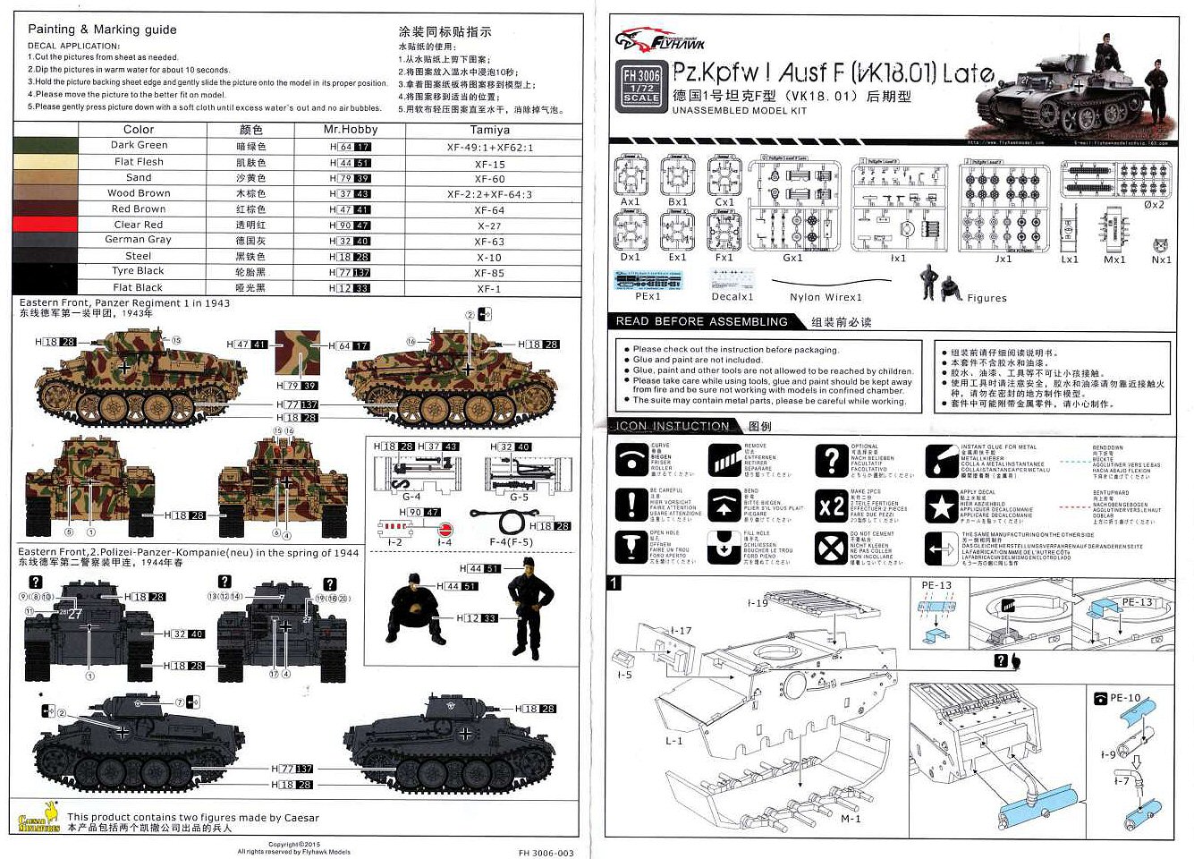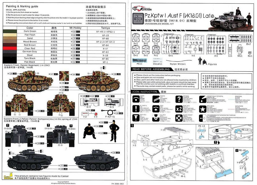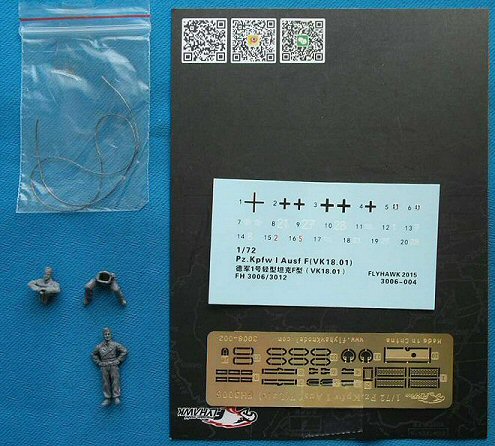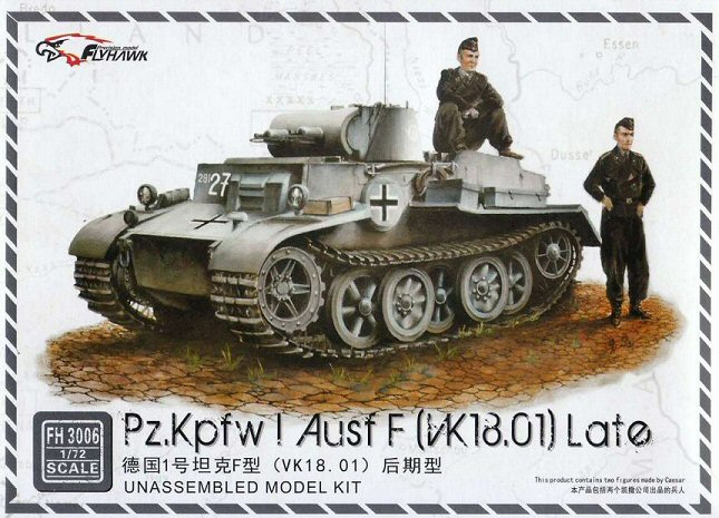 History While most modelers are familiar with the Panzerkampfwagen I Ausf.A and Ausf.B, the Ausf.C (VK 6.01) and Ausf.F (VK 18.01, also known for a while as Pz.Kpfw.I Neue Art Verstärkt) are somewhat more obscure. Even though all four Ausführungen shared the name "Pz.Kpfw I", the Ausf.C and Ausf.F had very little in common with the Ausf.A and Ausf.B, or with each other for that matter. The Ausf.C was meant as a very fast light tank, while the Ausf. F was meant as a very slow and heavily armored AFV. If the Ausf.F had anything in common it is with the Pz.Kpfw. II Ausf.J (VK 16.01), which, incidentally, Flyhawk has annouced as its next kit. A Versuchsfahrgestell