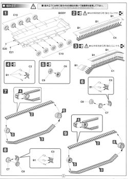 Upon my initial perusal, the surface detail looked a bit spartan (i.e. lots of clean facets devoid of any detail) but in comparison to photos of the actual vehicle, this appears to be appropriate (though I remain suspicious about the engine deck). Fujimi has continued on with the "not so fine tradition" of many manufacturers in this scale in moulding the pioneer tools integrally with the upper hull. It baffles me that they would take the effort to give us 132 separate track pads, but not make the minimal effort to provide a separate shovel, axe and sledge hammer (?????). The moulded on shovel is abominable by the way. The suspension arms seem quite simplified to me as well, though I suppose they will be barely visible behind the wheels and skirts.