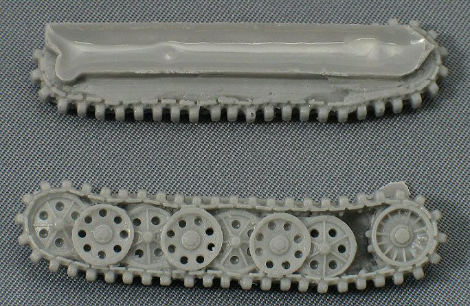 | The suspension and tracks are moulded in one big piece. However, detail is not always sharp and the space between the wheels and tracks has a number of visible resin imperfections. Additionally, the way the tracks lie on top of the wheels doesn't look correct to me... | |||